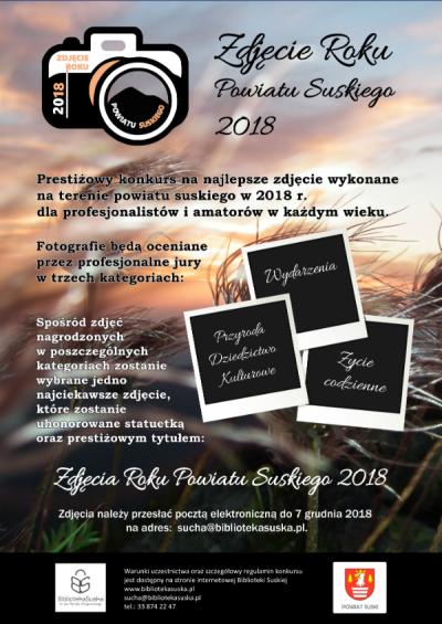 Biblioteka Suska wraz ze Starostwem Powiatowym w Suchej Beskidzkiej serdecznie zaprasza fotografików amatorów i profesjonalistów do udziału w Powiatowym Konkursie Fotograficznym – ZDJĘCIE ROKU POWIATU SUSKIEGO 2018.