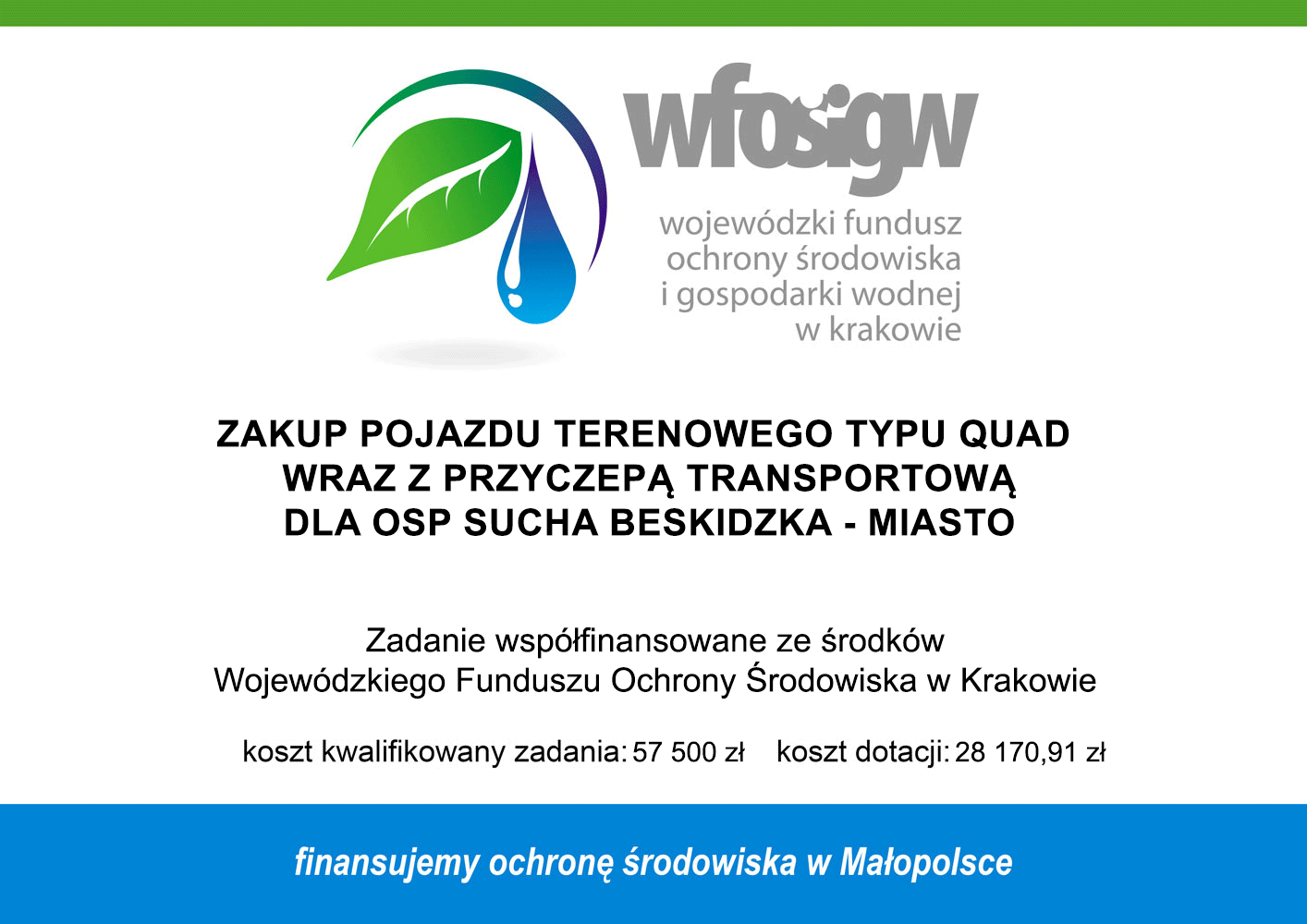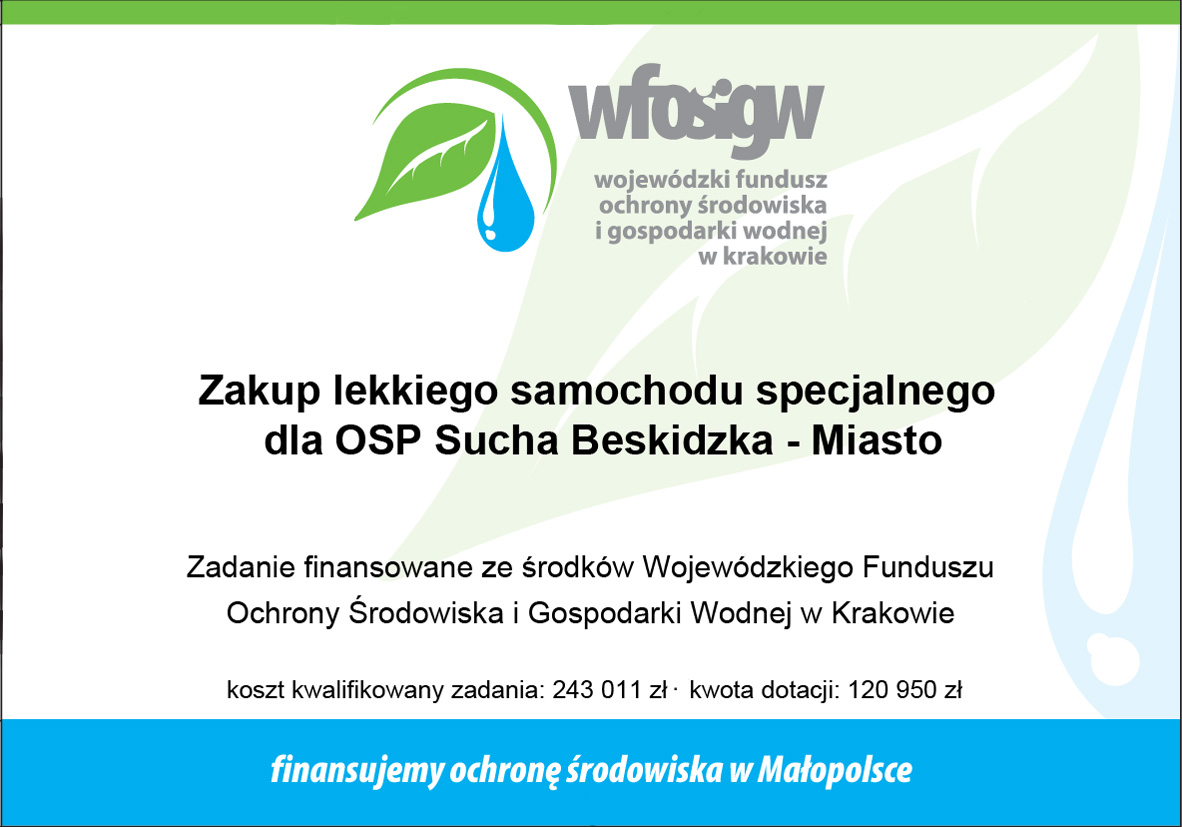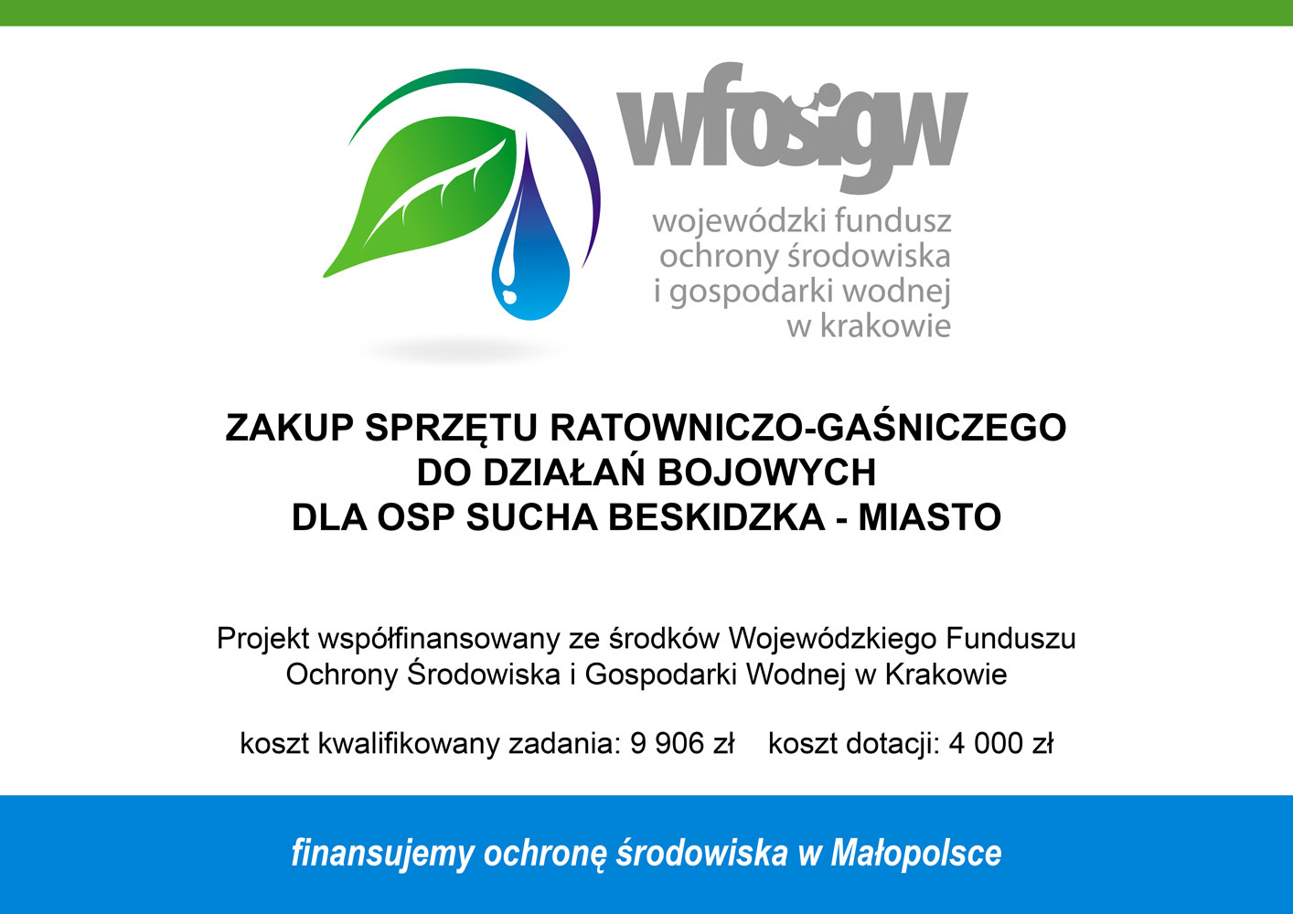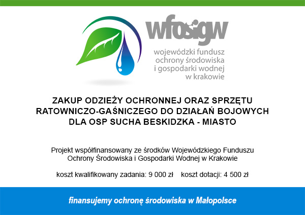 Zadanie realizowane było dzięki wsparciu finansowemu Wojewódzkiego Funduszu Ochrony Środowiska w Krakowie w ramach Programu „Zapobieganie poważnym awariom i likwidacja ich skutków dla środowiska - Bezpieczny Strażak” oraz budżetu jednostki OSP Sucha Beskidzka – Miasto.
