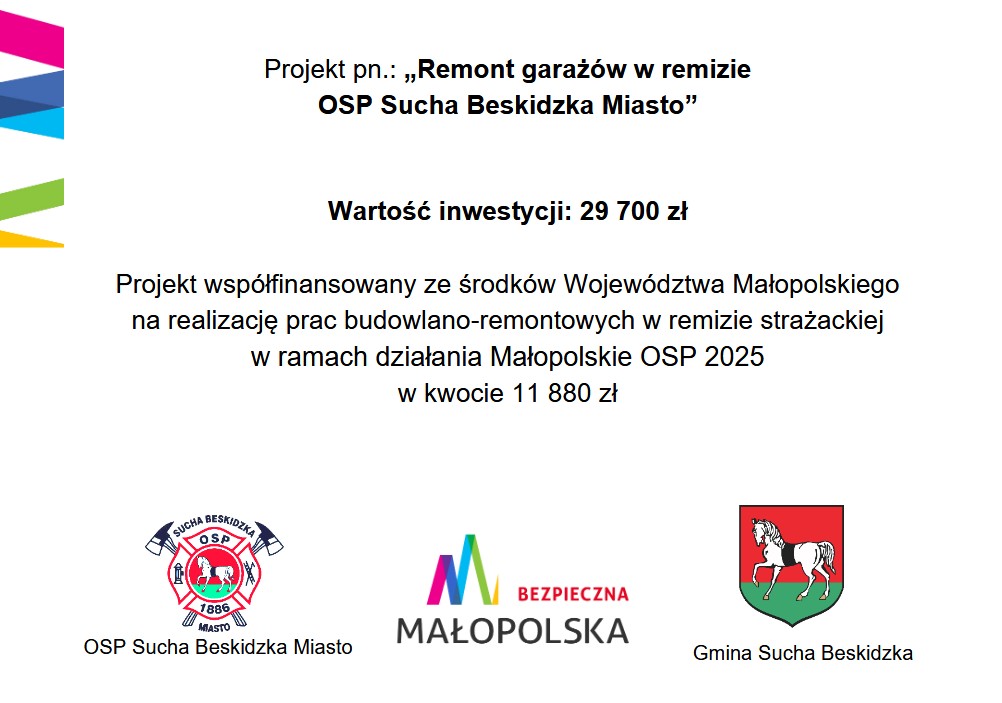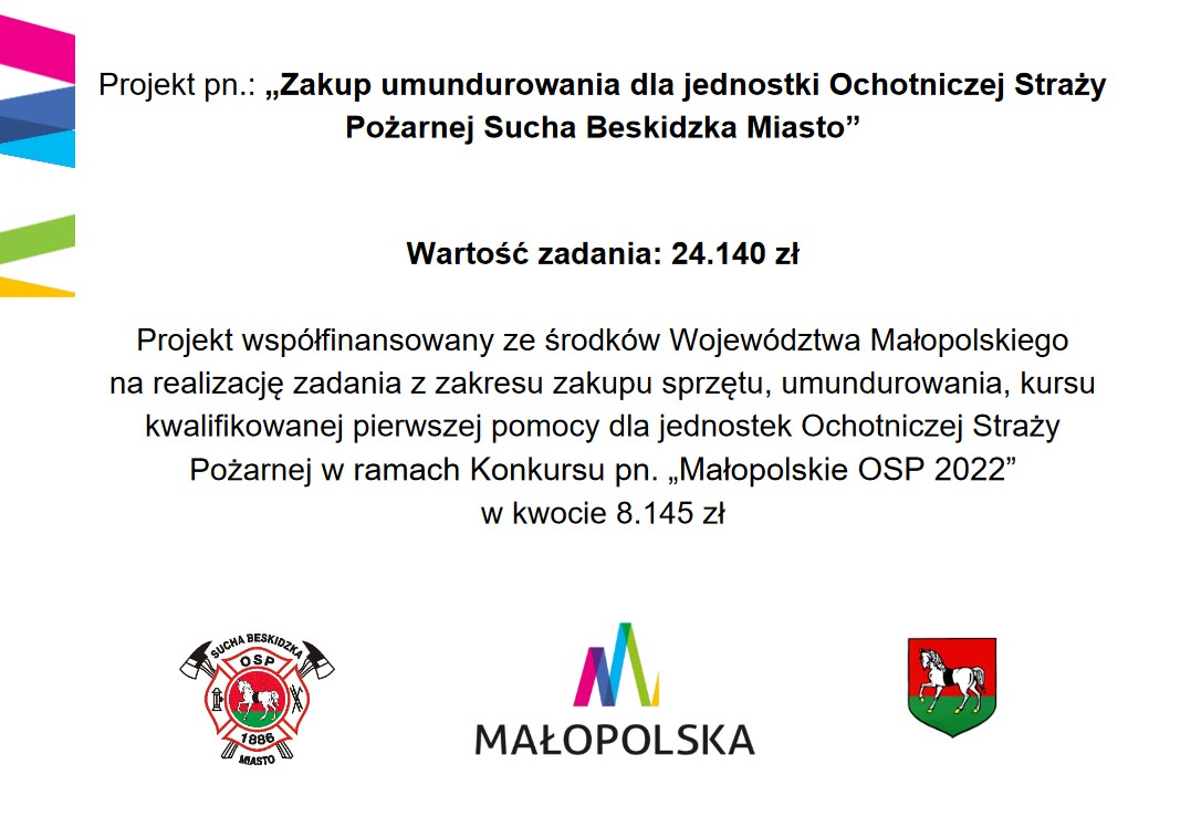 Zadanie realizowane jest przy wsparciu finansowym Wojewódzkiego Funduszu Ochrony Środowiska i Gospodarki Wodnej w Krakowie w ramach Programu „Zapobieganie poważnym awariom i likwidacja ich skutków dla środowiska - Bezpieczny Strażak”, budżetu Województwa Małopolskiego w ramach Programu „Małopolskie OSP”, budżetu Gminy Sucha Beskidzka oraz budżetu jednostki OSP Sucha Beskidzka – Miasto.