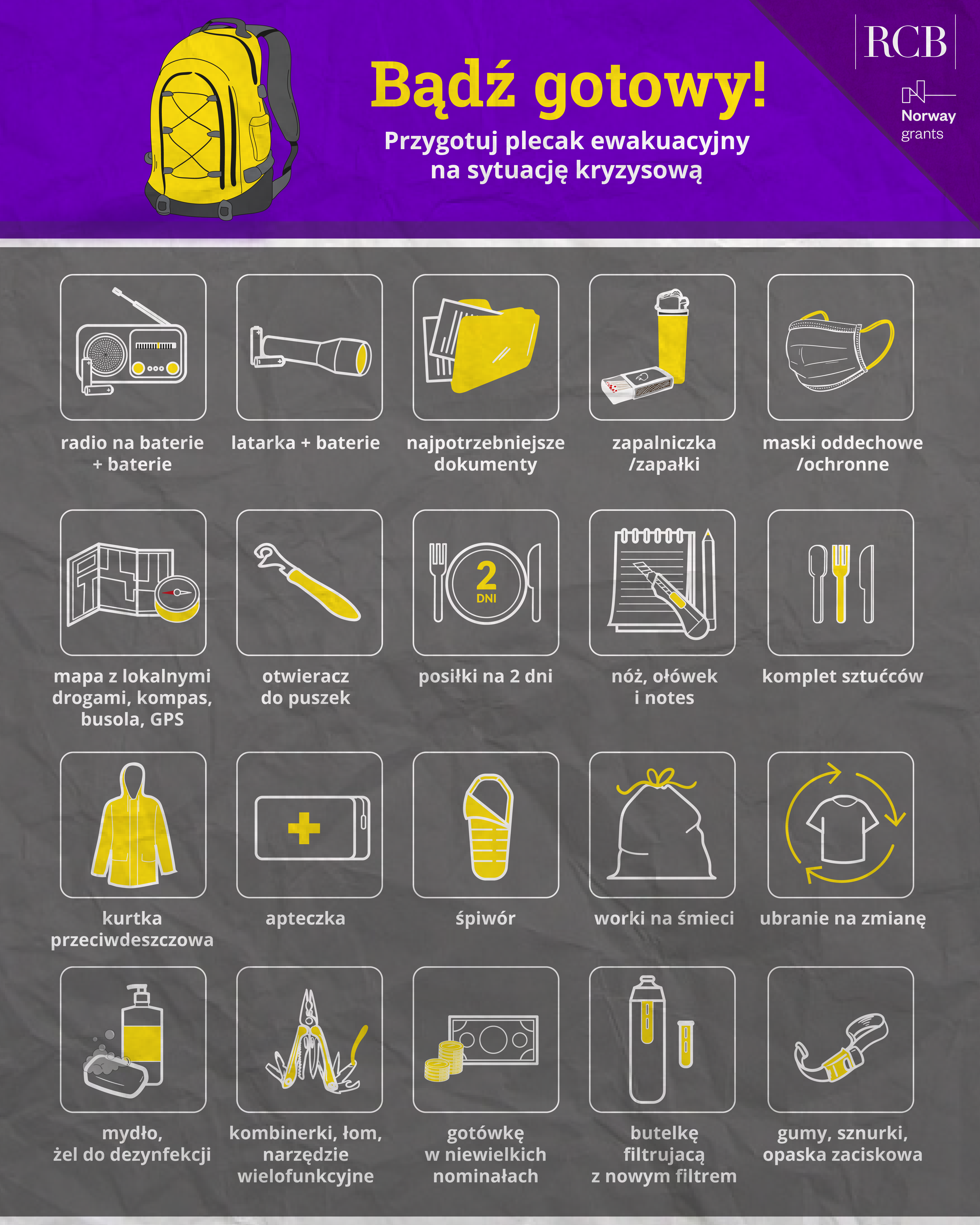 Plecak ewakuacyjny powinien być wyposażony w przedmioty umożliwiające przetrwanie przez kilka pierwszych dni. Oto szczegółowa lista: