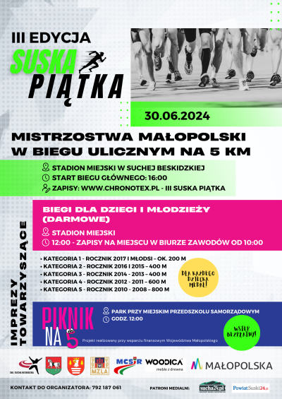 Wysoki poziom sportowy, a przede wszystkim bardzo dobra organizacja dwóch pierwszych edycji biegu ulicznego „Suska Piątka” spowodowały, że jego tegoroczna edycja, która odbędzie się już 30 czerwca będzie miała zdecydowanie wyższą rangę! Małopolski Związek Lekkiej Atletyki przyznał zawodom status Mistrzostw Małopolski w Biegu Ulicznym na 5 km. Wydarzenie adresowane jest również do dzieci, dla których przygotowano wiele atrakcji.