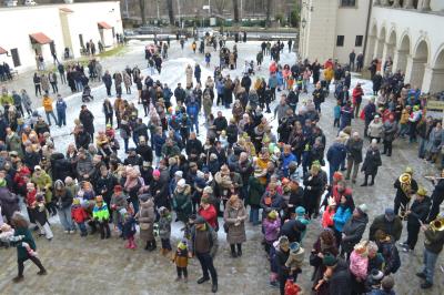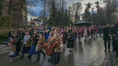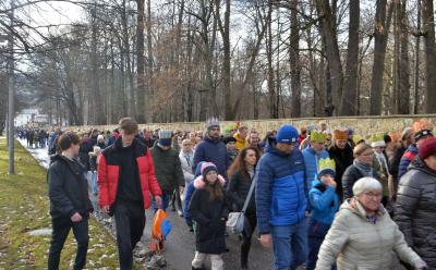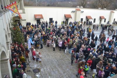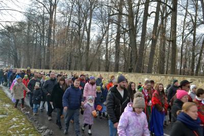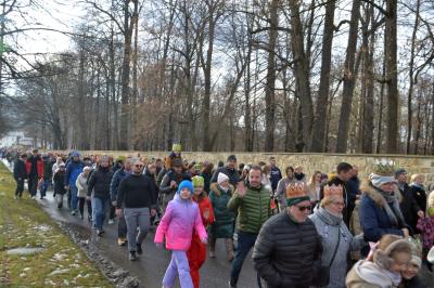 Po nabożeństwie wierni licznie przemaszerowali ulicami miasta na zamkowy dziedziniec. W barwnym korowodzie Trzem Mędrcom ze Wschodu towarzyszyły dzieci, młodzież i dorośli. Podobnie jak w minionych latach głowy uczestników orszaku były przyozdobione koronami, które wraz ze śpiewnikami przygotowali organizatorzy uroczystości - Parafia Nawiedzenia Najświętszej Maryi Panny, Burmistrz Miasta Sucha Beskidzka oraz Centrum Kultury i Filmu.
