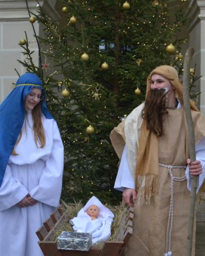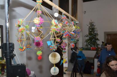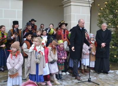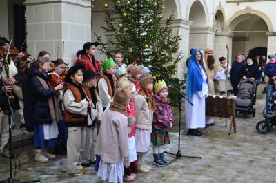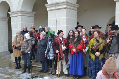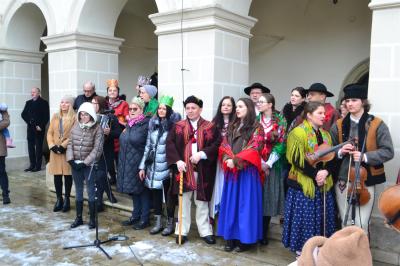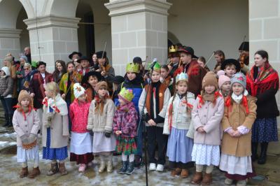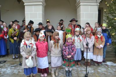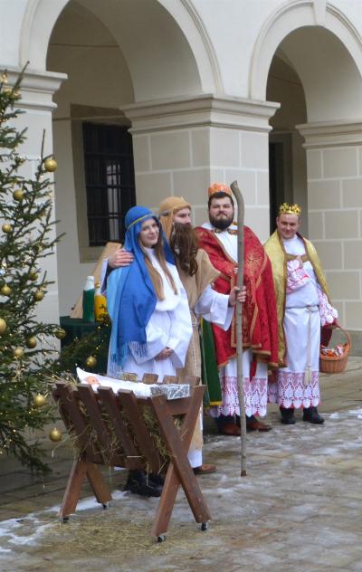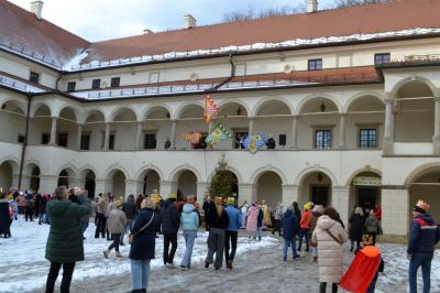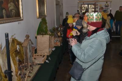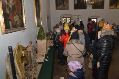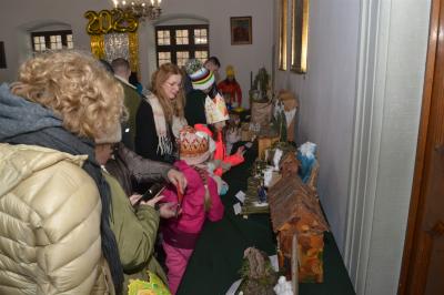 Po zakończeniu wspólnego kolędowania wiele osób zdecydowało się pozostać na terenie zespołu zamkowo-parkowego, biorąc udział w otwarciu wystawy prac złożonych na miejski etap powiatowego konkursu Babiogórska Szopka Regionalna.