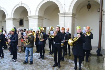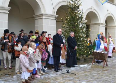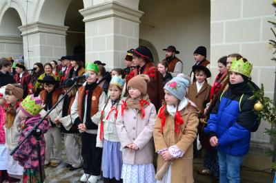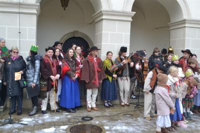 Po dotarciu na zamkowy dziedziniec Trzej Królowie, którzy wędrowali na czele orszaku, weszli na krużganki, aby symbolicznie pozdrowić uczestników uroczystości. Następnie głos zabrał proboszcz suskiej parafii ks. Wiesław Popielarczyk, dziękując mieszkańcom za liczny udział w wydarzeniu, a Burmistrz Miasta Stanisław Lichosyt złożył życzenia noworoczne. Następnie rozpoczęło się wspólne kolędowanie, które zainicjowały i poprowadziły suskie zespoły i kapele regionalne, a także chór „Jasień” oraz muzycy Miejskiej Orkiestry Dętej. W międzyczasie mędrcy obdarowali słodyczami najmłodszych uczestników wydarzenia.