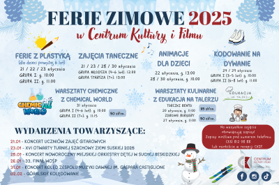 Szeroką i urozmaiconą ofertę proponuje na ferie Centrum Kultury i Filmu w Suchej Beskidzkiej. Dla miłośników sztuki przygotowano warsztaty „Ferie z plastyką”, które pozwolą dzieciom uwolnić wyobraźnię i stworzyć własne dzieła, a dla pragnących spędzić czas bardziej aktywnie, energetyczne zajęcia taneczne. W programie na ferie znalazły się także kreatywne gry i zabawy „Kodowanie na dywanie”. CKiF zaprasza także do udziału w warsztatach specjalistycznych. Warsztaty chemiczne z ChemicAl World, to spotkanie z nauką, podczas którego uczestnicy przeprowadzą fascynujące eksperymenty i poczują się jak prawdziwi chemicy. Natomiast „Edukacja na talerzu”, dadzą możliwość zamienienia kuchni w pole do kulinarnych eksperymentów, ucząc jednocześnie podstaw gotowania i estetyki podania potraw, a to wszystko w atmosferze pełniej inspiracji i dobrej zabawy.