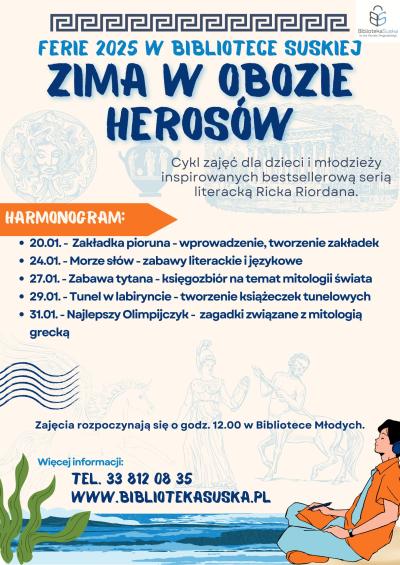 W Bibliotece Suskiej zapowiada się wyjątkowa zimowa przygoda, która przeniesie dzieci i młodzież w fascynujący świat mitologii greckiej. Podczas ferii odbędzie się cykl zajęć zatytułowany „Zima w obozie herosów”, inspirowany bestsellerową serią książek Ricka Riordana. Uczestnicy będą mieli okazję nie tylko poszerzyć swoją wiedzę na temat starożytnych mitów, ale także wziąć udział w kreatywnych warsztatach i literackich zabawach.