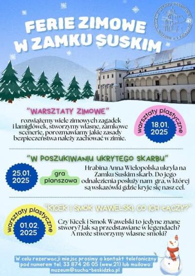 Muzeum Miejskie Suchej Beskidzkiej zaprasza dzieci w wieku 8-11 lat na wyjątkowe ferie zimowe, które obfitują w kreatywne i edukacyjne atrakcje. Tegoroczny program to doskonała okazja do nauki poprzez zabawę oraz rozwijania wyobraźni w wyjątkowym otoczeniu zabytkowego zamku. Przygotowane warsztaty i gry pozwolą uczestnikom przenieść się w świat legend, tajemnic i artystycznych wyzwań.