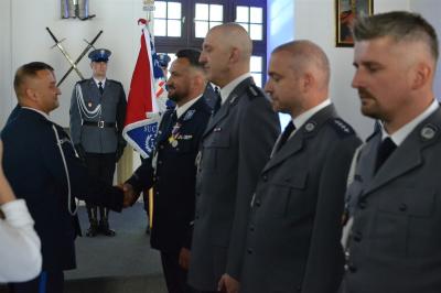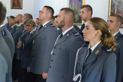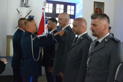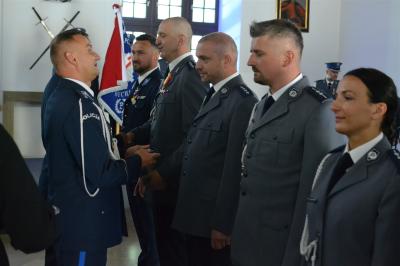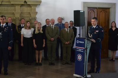 Przybyłych gości oraz policjantów powitał Komendant Powiatowy Policji w Suchej Beskidzkiej mł. insp. Daniel Chlebda. W swoim przemówieniu nawiązał do obchodzonego w tym roku jubileuszu 106. rocznicy utworzenia Policji Państwowej, podkreślając, że rok 2025 jest również obchodzony jako 100-lecie utworzenia Policji kobiecej. Komendant gorąco dziękował policjantom i pracownikom Policji za ich poświęcenie i sumienną, rzetelną pracę, a rodzinom funkcjonariuszy za wyrozumiałość i wsparcie. Samorządowcom podziękował za wspieranie inicjatyw Policji związanych z dbaniem o bezpieczeństwo, ład i porządek publiczny.