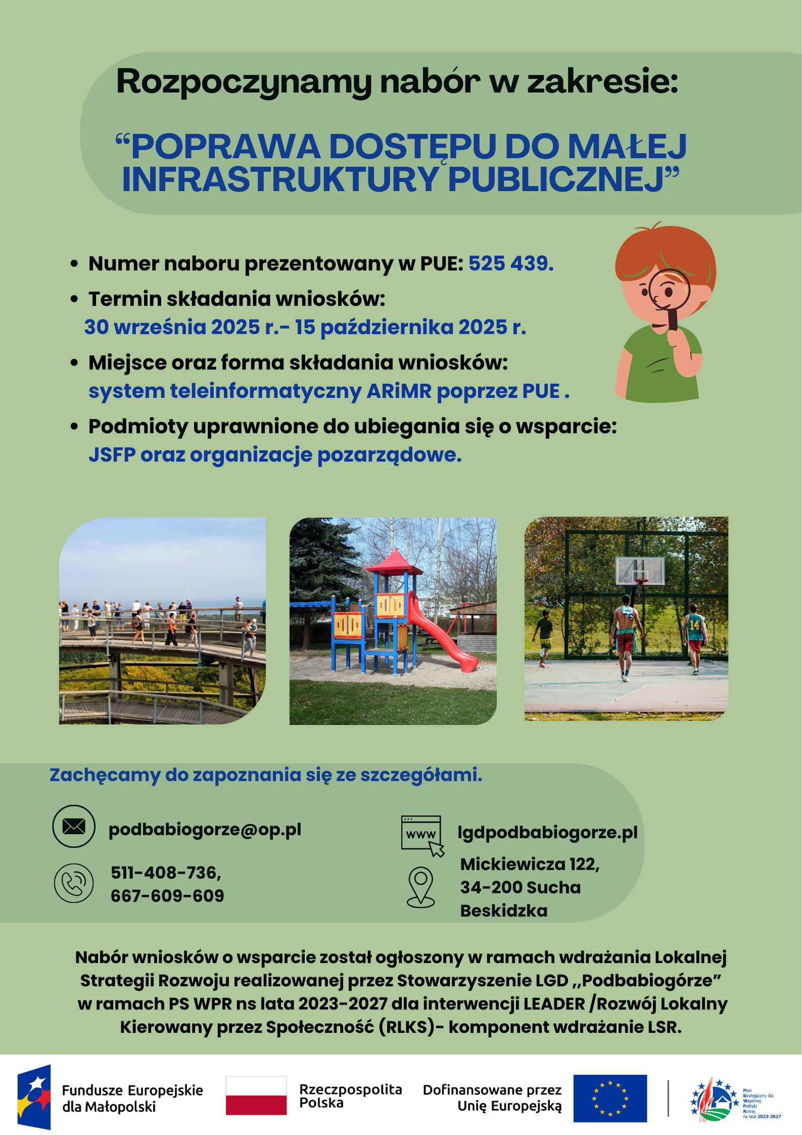 Szczegółowe informacje dotyczące zasad naboru, wysokości wsparcia oraz wymaganych dokumentów można znaleźć na stronie internetowej www.lgdpodbabiogorze.pl