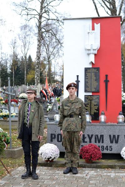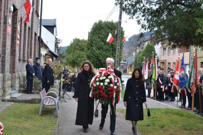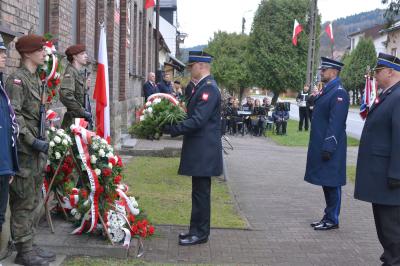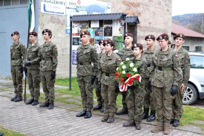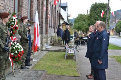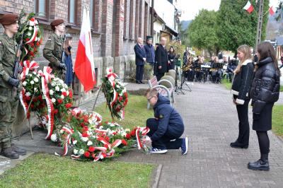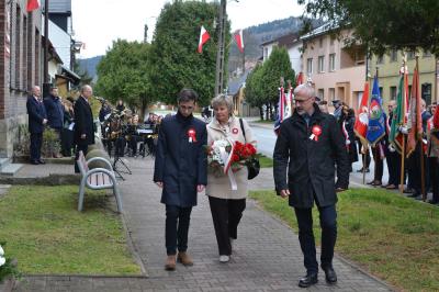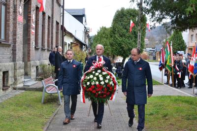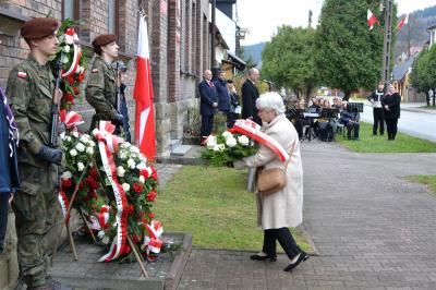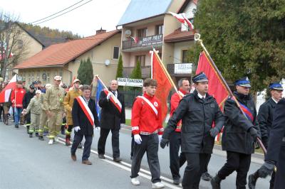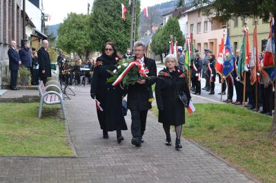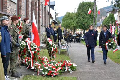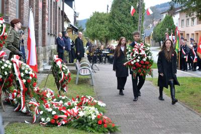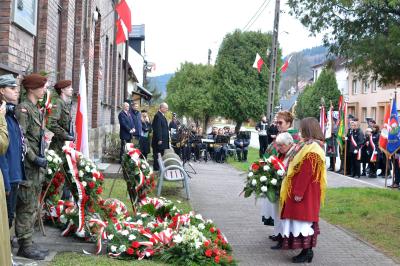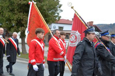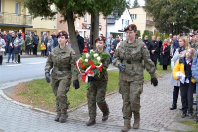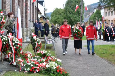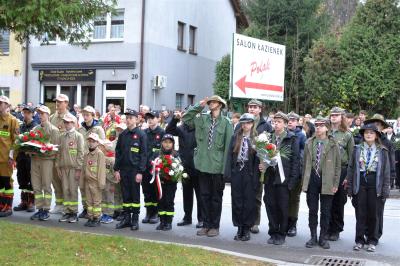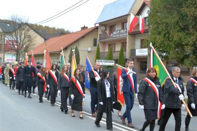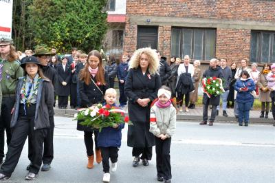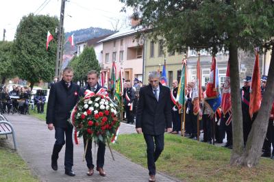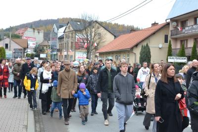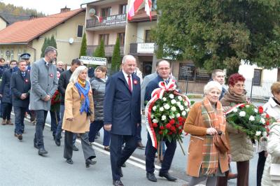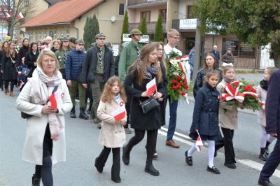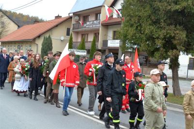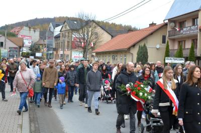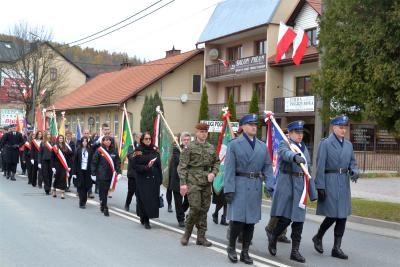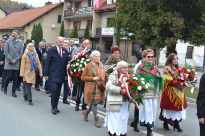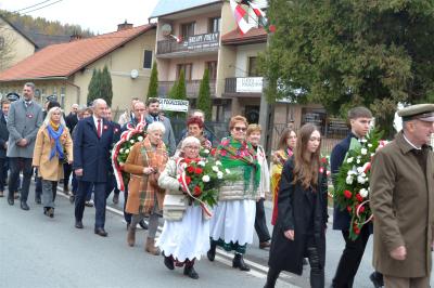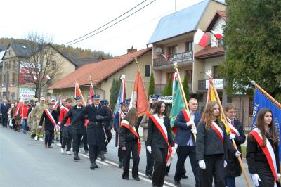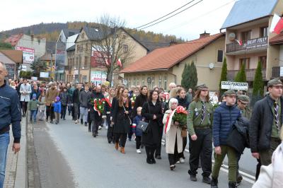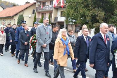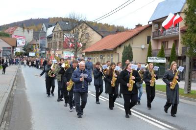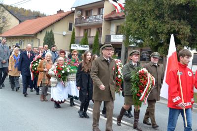 Po zakończeniu nabożeństwa przedstawiciele samorządu, instytucji i stowarzyszeń, a także licznie zebrani mieszkańcy Suchej Beskidzkiej w asyście pocztów sztandarowych wzięli udział w uroczystym przemarszu prowadzonym przez Miejską Orkiestrę Dętą. Pochód udał się na ulicę Józefa Piłsudskiego, gdzie pod tablicą upamiętniającą postać Marszałka złożono wieńce i kwiaty, oddając hołd wszystkim, którzy walczyli o wolność i niepodległość Ojczyzny. W tym wyjątkowym dniu wartę honorową przy tablicy oraz przy pomniku poległych żołnierzy na suskim cmentarzu pełniła Jednostka Strzelecka 3031 Sucha Beskidzka wraz z suskimi drużynami Związku Harcerstwa Polskiego. Uroczystość rozpoczęła się od wspólnego odśpiewania Hymnu Państwowego, a jej zwieńczeniem było wykonanie przez orkiestrę „Roty”, która w Dzień Niepodległości wybrzmiała wyjątkowo podniośle.