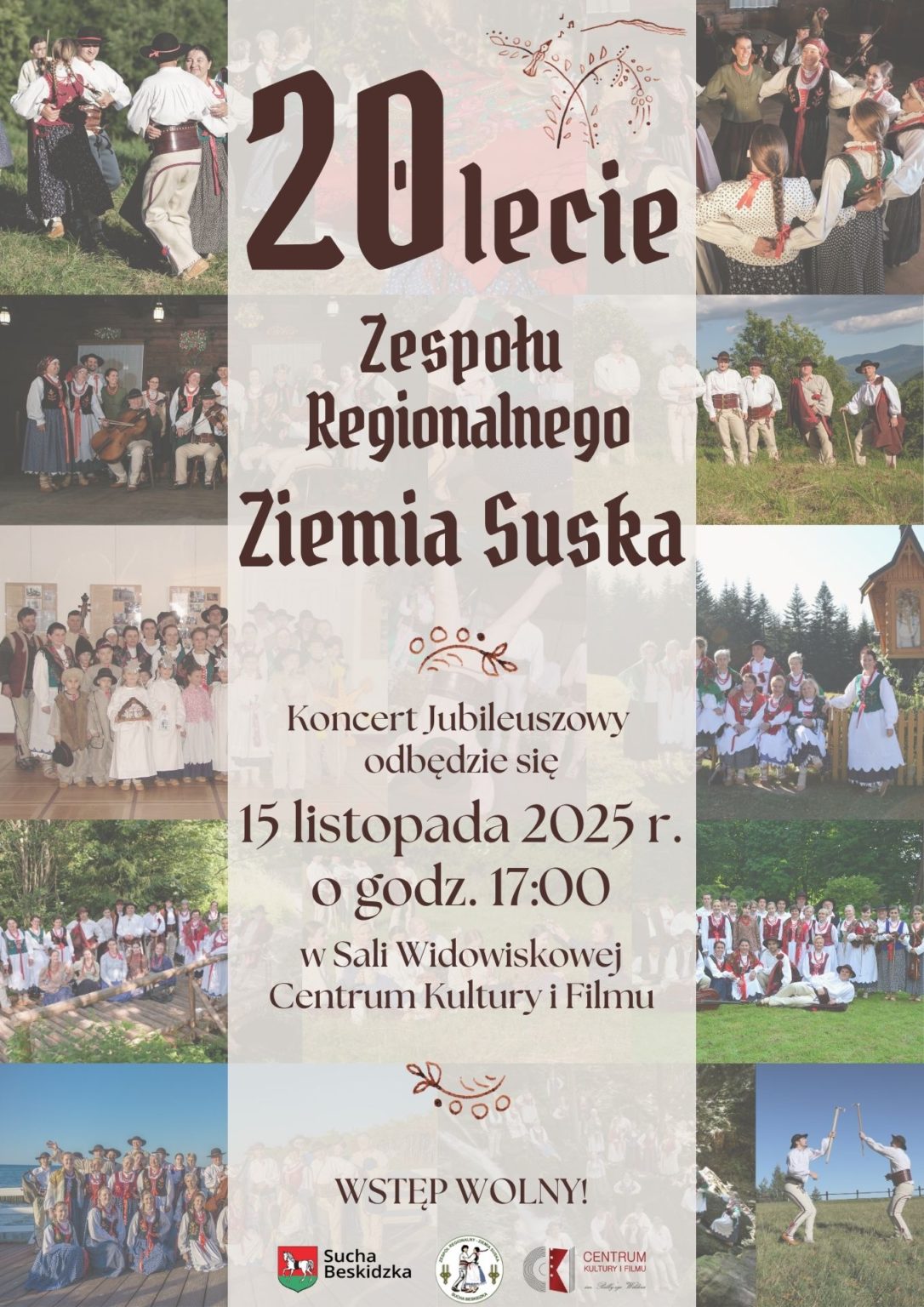 W sobotnie popołudnie, 15 listopada w sali widowiskowej Centrum Kultury i Filmu w Suchej Beskidzkiej odbędzie się wyjątkowe wydarzenie. Swój jubileusz 20-lecia działalności świętować będzie Zespół Regionalny Ziemia Suska. Z tej okazji o godz. 17.00 odbędzie się jubileuszowy koncert, na który zapraszamy wszystkich miłośników folkloru, sympatyków kultury regionalnej oraz mieszkańców miasta i okolic.