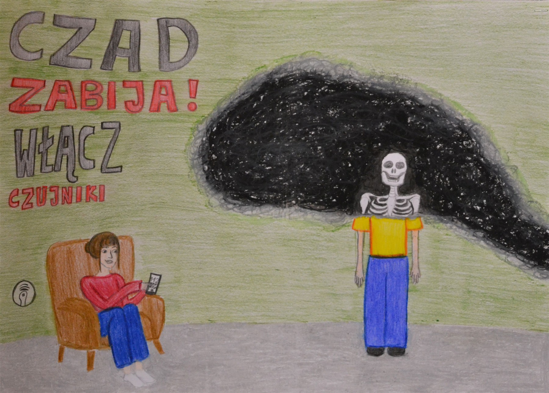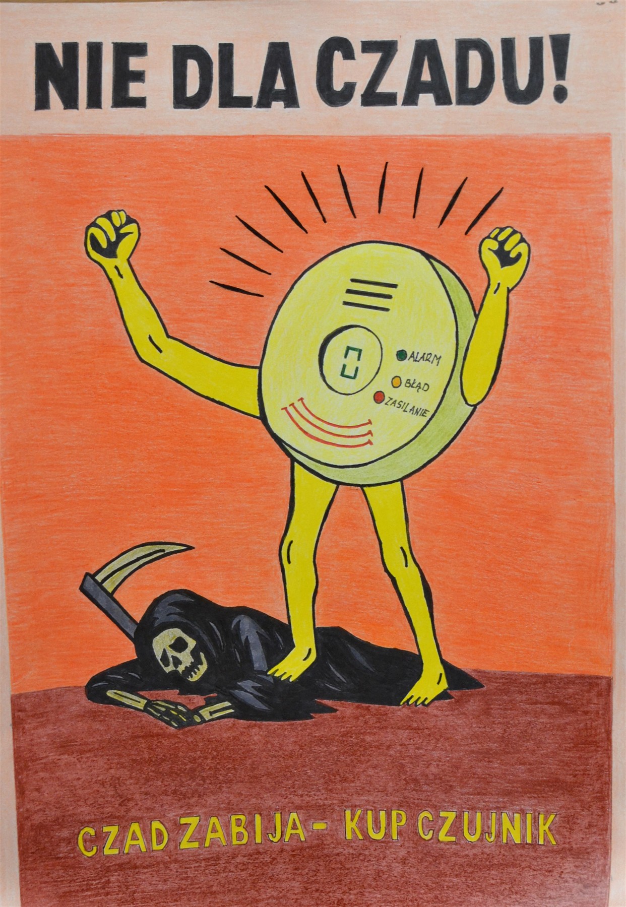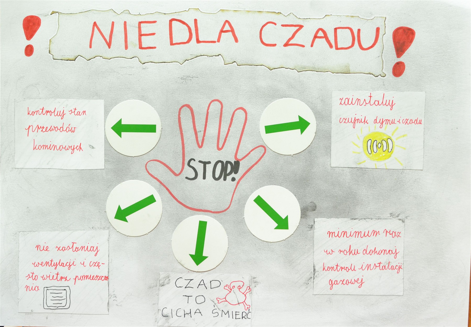Jesienią i zimą pojawia się jednak inne poważne zagrożenie – zatrucie tlenkiem węgla. Czad, nazywany „cichym zabójcą”, jest niewidoczny, bezwonny i pozbawiony smaku, a przy tym łatwo miesza się z powietrzem. Może wydobywać się z kominków, piecyków gazowych, pieców węglowych czy kuchenek, gdy dochodzi w nich do niepełnego spalania paliwa. Wdychany szybko przenika do krwi i może prowadzić do ciężkich uszkodzeń organizmu, utraty przytomności, a nawet śmierci. Co roku w Polsce czad zabija ponad sto osób, a kilka tysięcy ulega podtruciu. Aby zwiększyć świadomość tego zagrożenia wśród najmłodszych, w 2023 roku zmieniono temat gminnego konkursu plastycznego, nadając mu nazwę „Nie dla czadu!”.