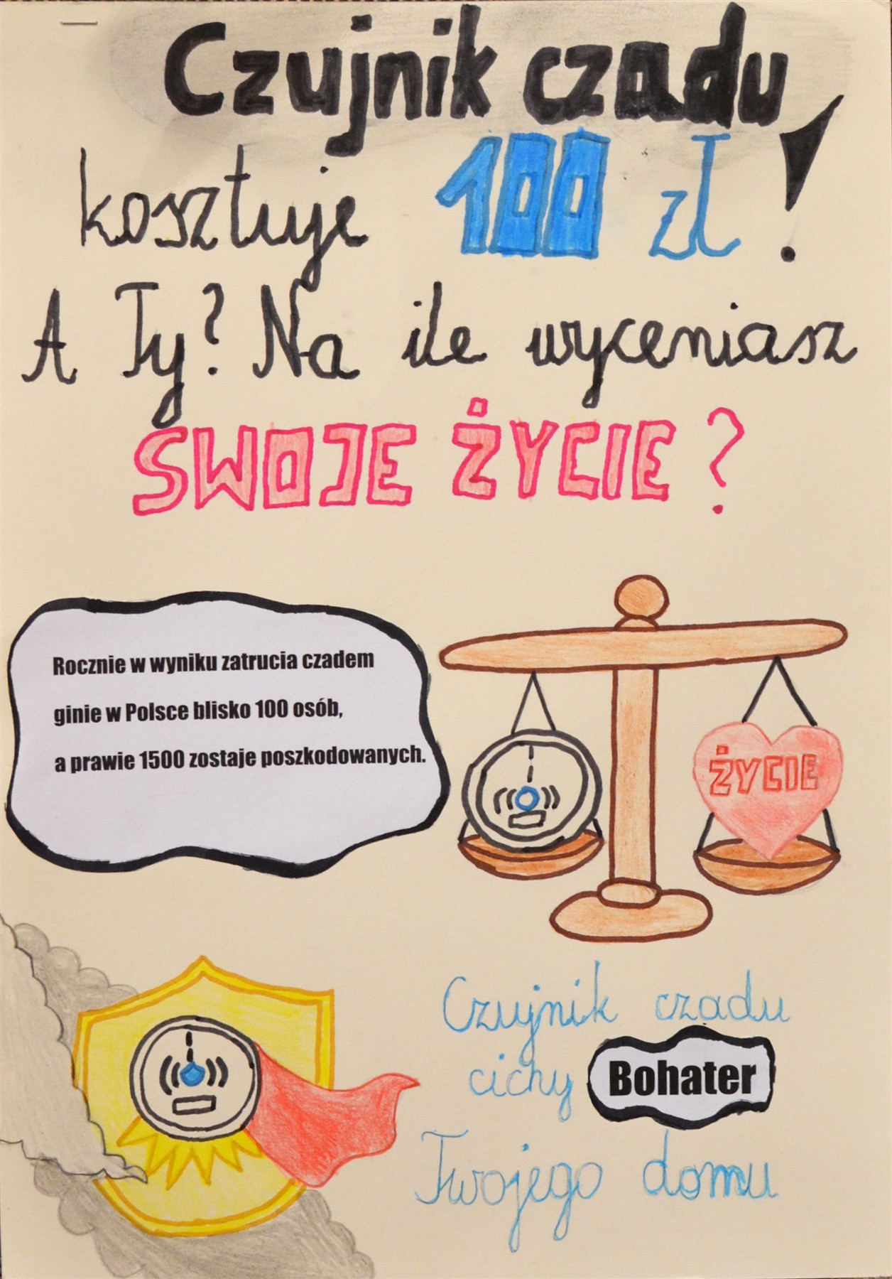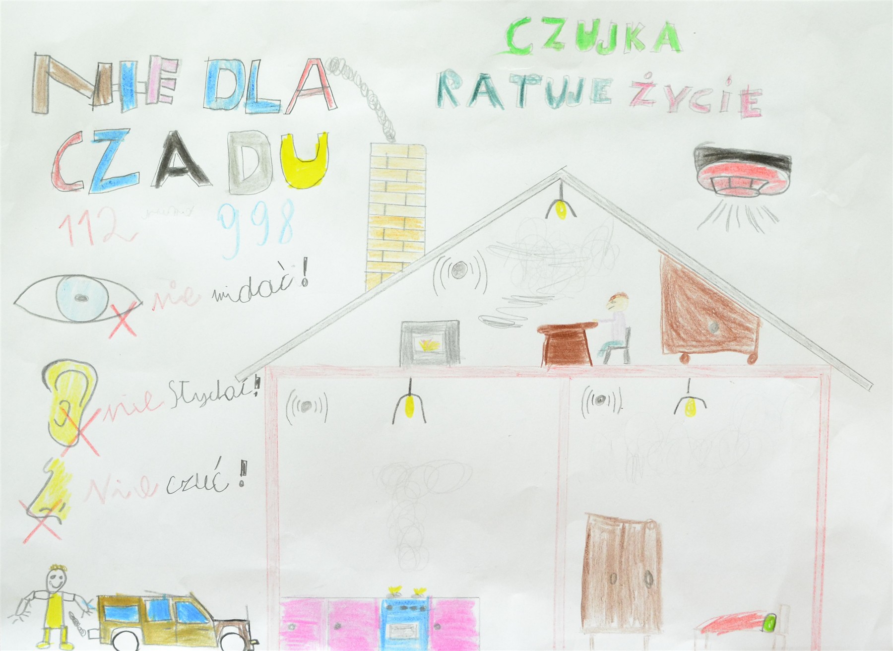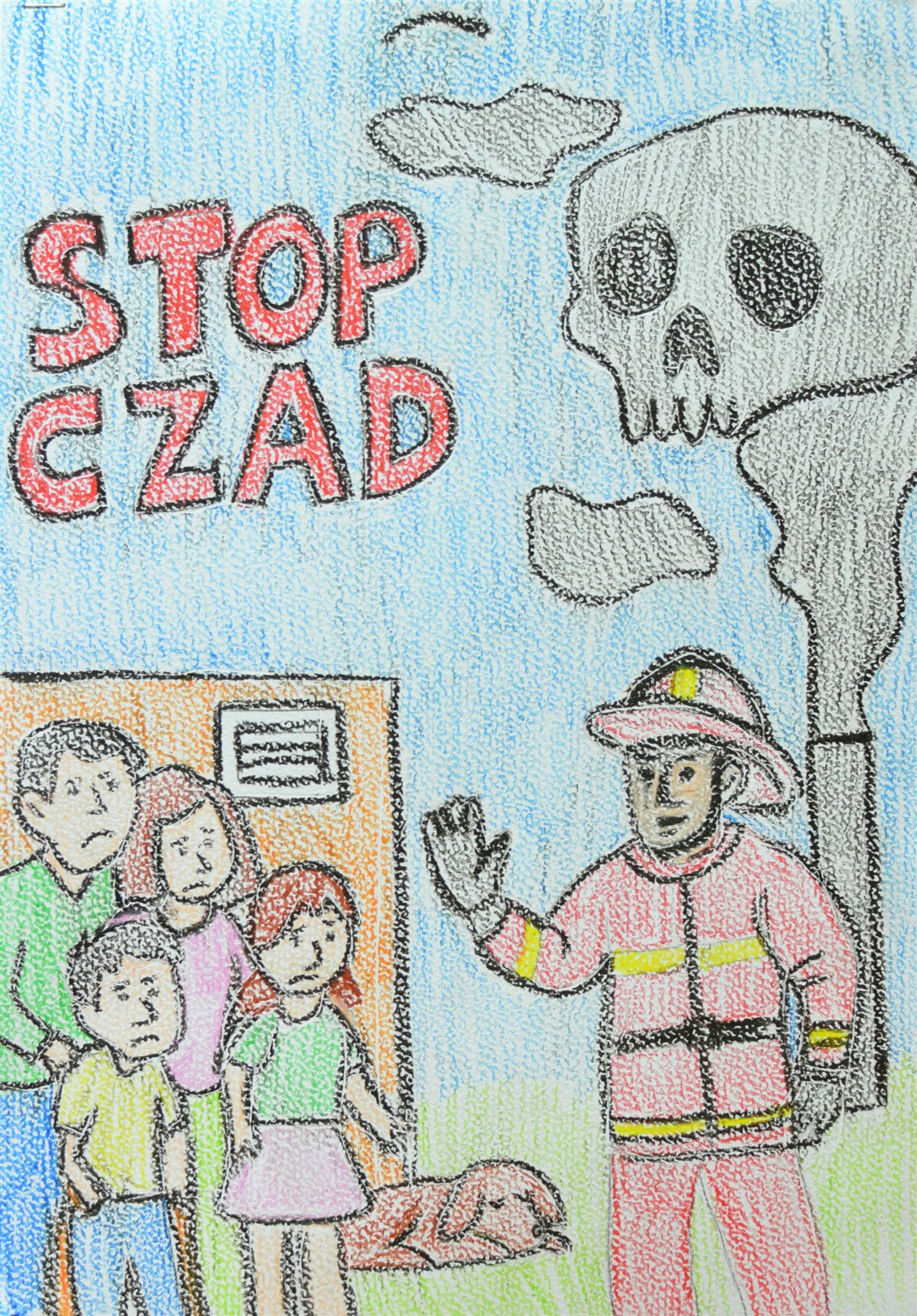 Jesienią i zimą pojawia się jednak inne poważne zagrożenie – zatrucie tlenkiem węgla. Czad, nazywany „cichym zabójcą”, jest niewidoczny, bezwonny i pozbawiony smaku, a przy tym łatwo miesza się z powietrzem. Może wydobywać się z kominków, piecyków gazowych, pieców węglowych czy kuchenek, gdy dochodzi w nich do niepełnego spalania paliwa. Wdychany szybko przenika do krwi i może prowadzić do ciężkich uszkodzeń organizmu, utraty przytomności, a nawet śmierci. Co roku w Polsce czad zabija ponad sto osób, a kilka tysięcy ulega podtruciu. Aby zwiększyć świadomość tego zagrożenia wśród najmłodszych, w 2023 roku zmieniono temat gminnego konkursu plastycznego, nadając mu nazwę „Nie dla czadu!”.
