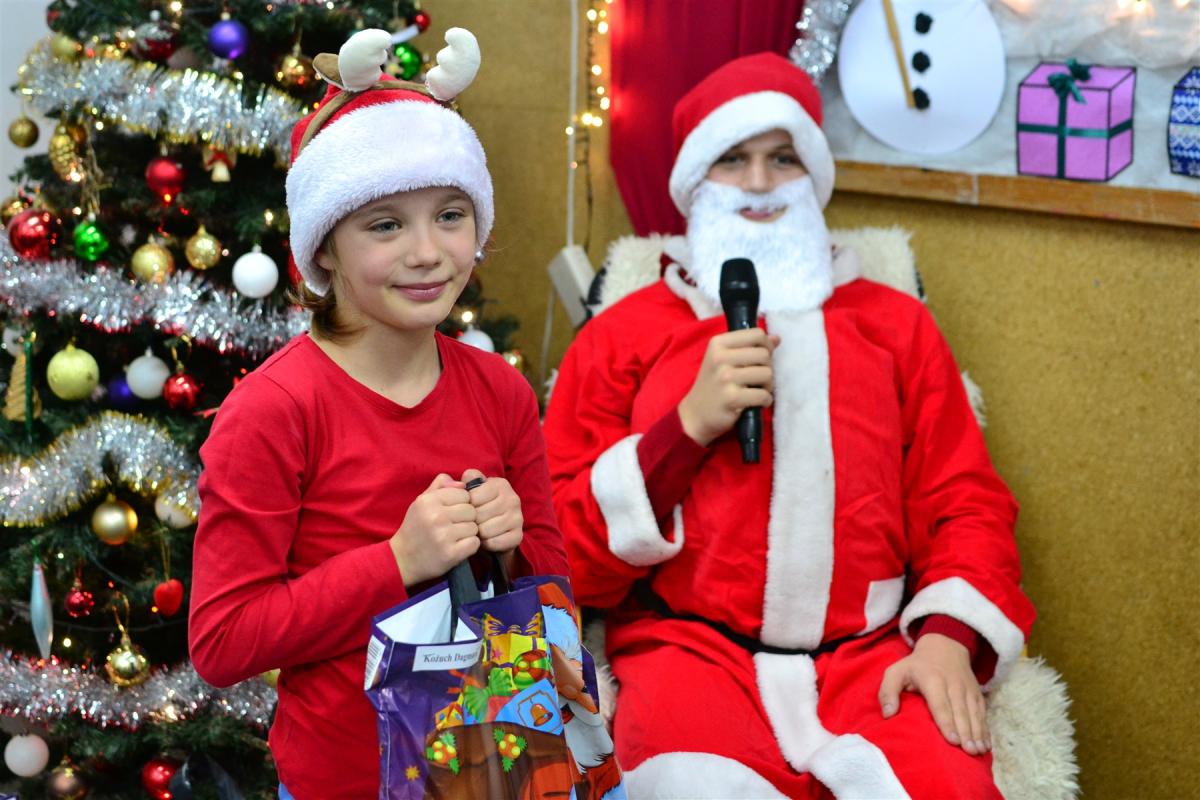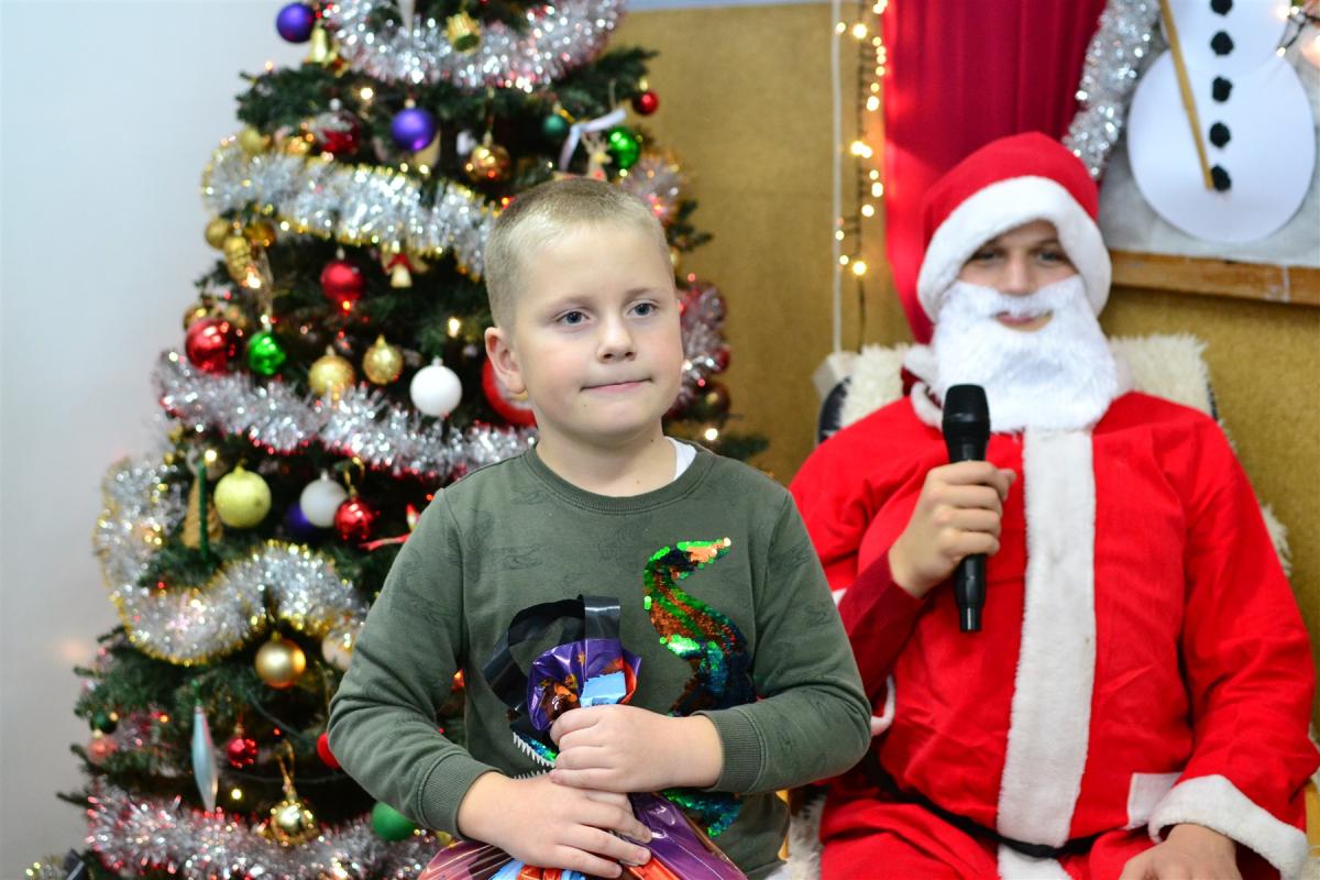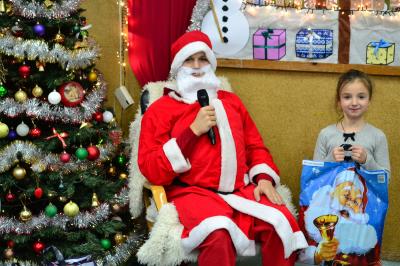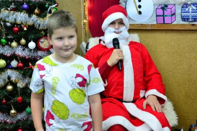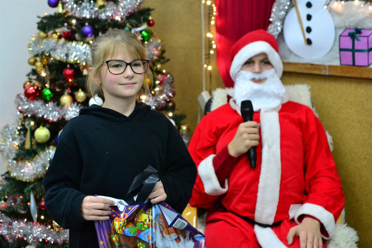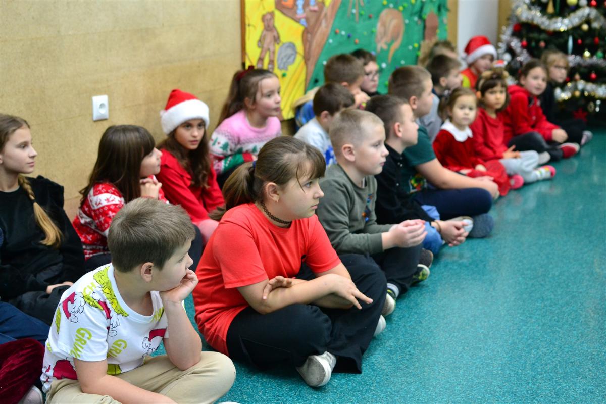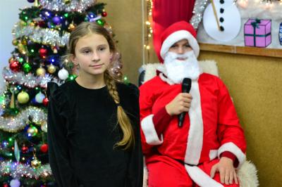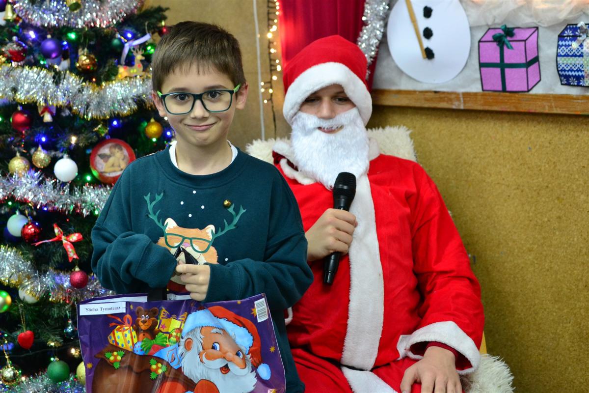 Święty Mikołaj nie zawitał w Świetlicy sam. Przybył w asyście swoich pomocników – roześmianych aniołów i sympatycznego, acz czujnego, diabełka. Dostojny gość, przywitany owacjami, rozsiadł się wygodnie na fotelu ustawionym pod okazałą, pięknie udekorowaną choinką. Wychowawczynie świetlicy co prawda potwierdziły, że wszyscy podopieczni byli w tym roku bardzo grzeczni, jednak Mikołaj postanowił każdorazowo osobiście to sprawdzić. Ucinał sobie przyjacielską pogawędkę, dopytując o miniony rok i plany na przyszłość. Inni z kolei, by udowodnić swoją doskonałą formę, z uśmiechem wykonywali kilka pompek, przysiadów czy pajacyków, wykazując się przy tym świetną koordynacją ruchową.