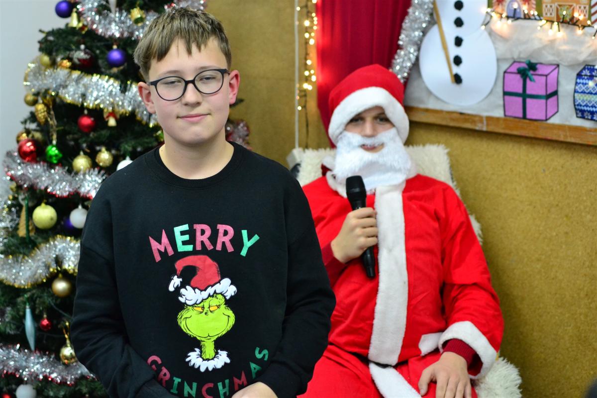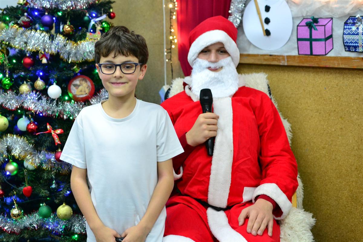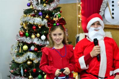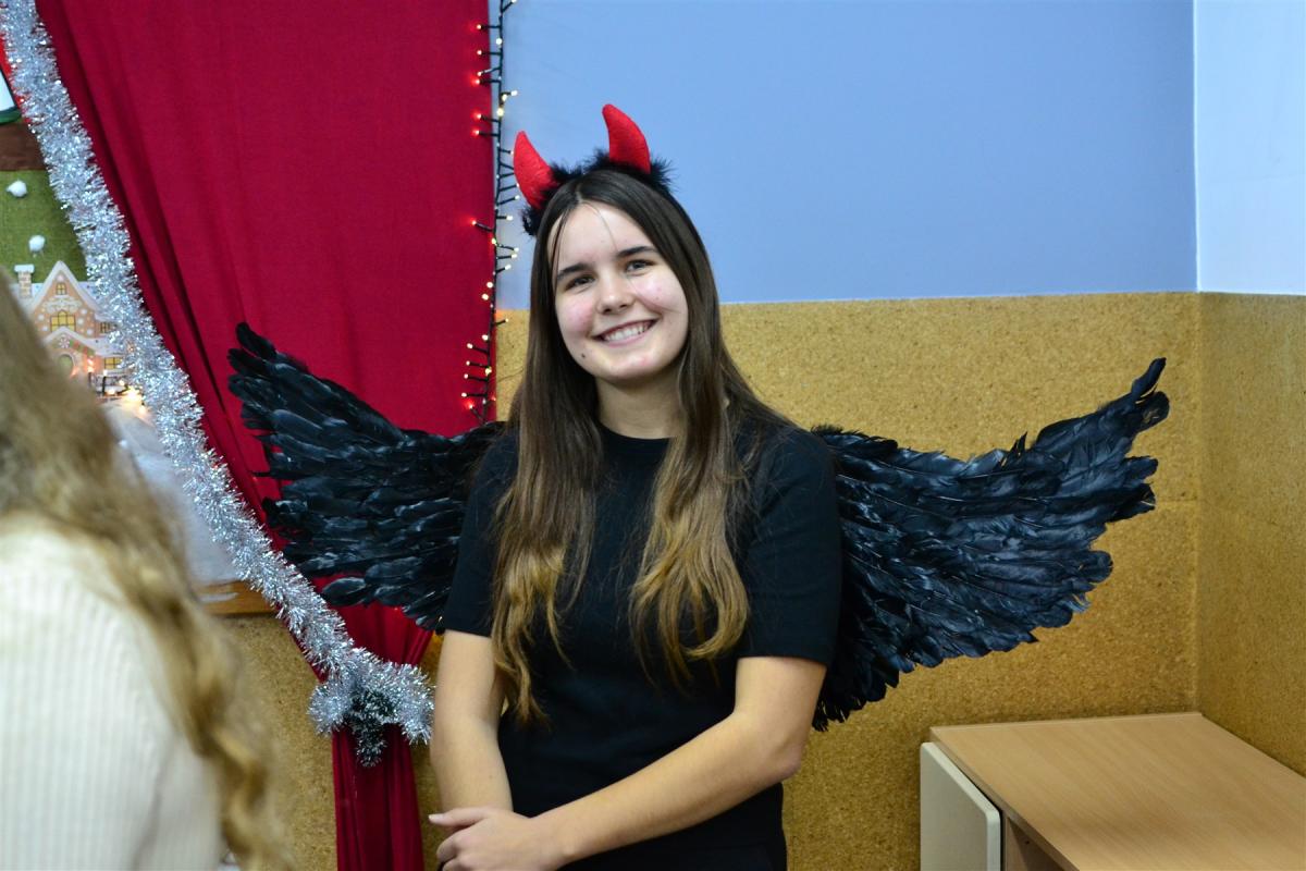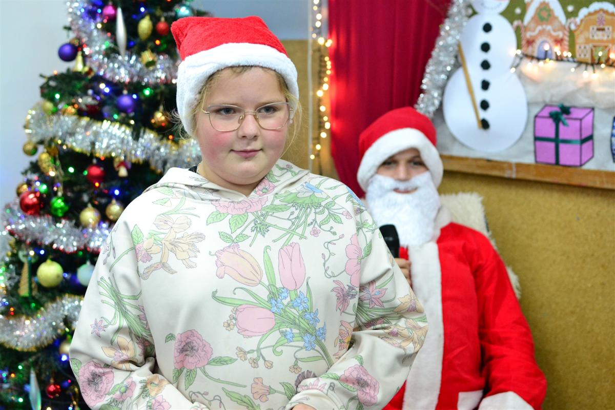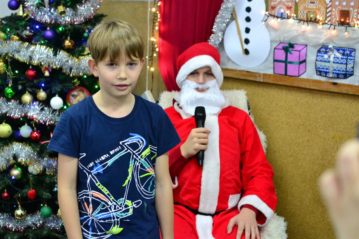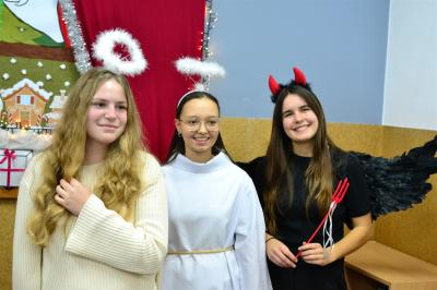 Święty Mikołaj nie zawitał w Świetlicy sam. Przybył w asyście swoich pomocników – roześmianych aniołów i sympatycznego, acz czujnego, diabełka. Dostojny gość, przywitany owacjami, rozsiadł się wygodnie na fotelu ustawionym pod okazałą, pięknie udekorowaną choinką. Wychowawczynie świetlicy co prawda potwierdziły, że wszyscy podopieczni byli w tym roku bardzo grzeczni, jednak Mikołaj postanowił każdorazowo osobiście to sprawdzić. Ucinał sobie przyjacielską pogawędkę, dopytując o miniony rok i plany na przyszłość. Inni z kolei, by udowodnić swoją doskonałą formę, z uśmiechem wykonywali kilka pompek, przysiadów czy pajacyków, wykazując się przy tym świetną koordynacją ruchową.