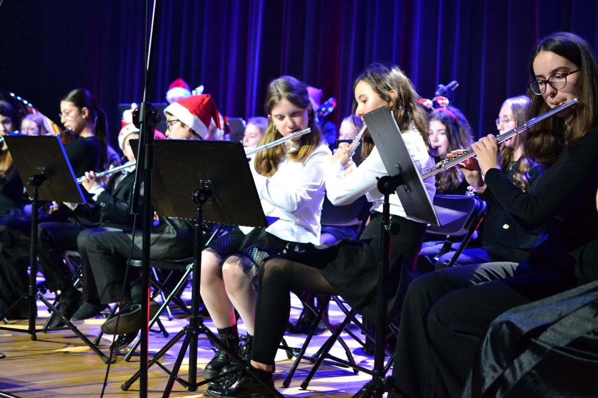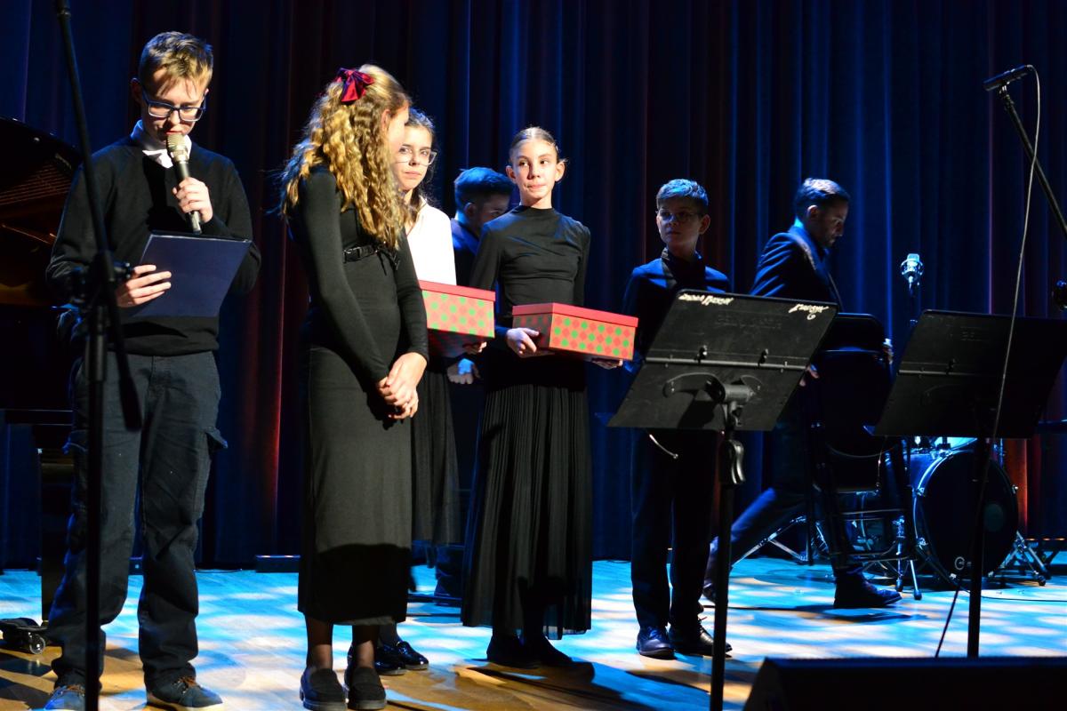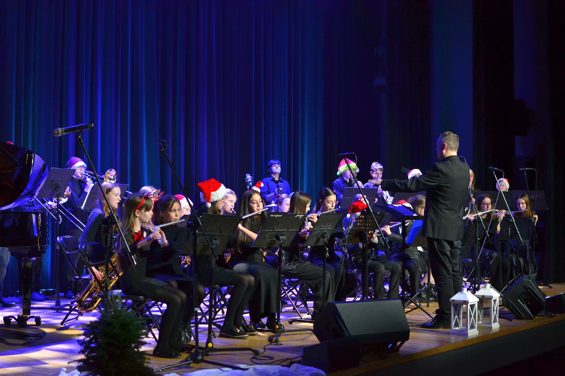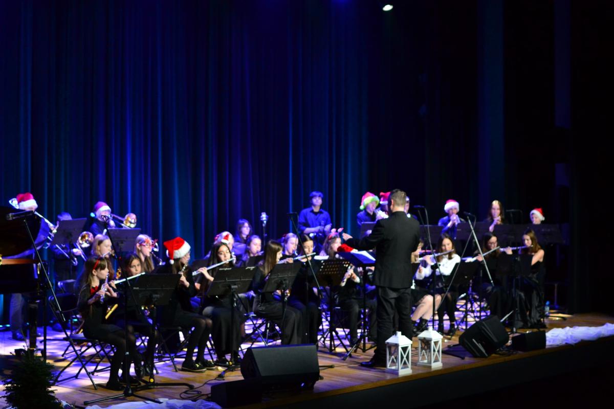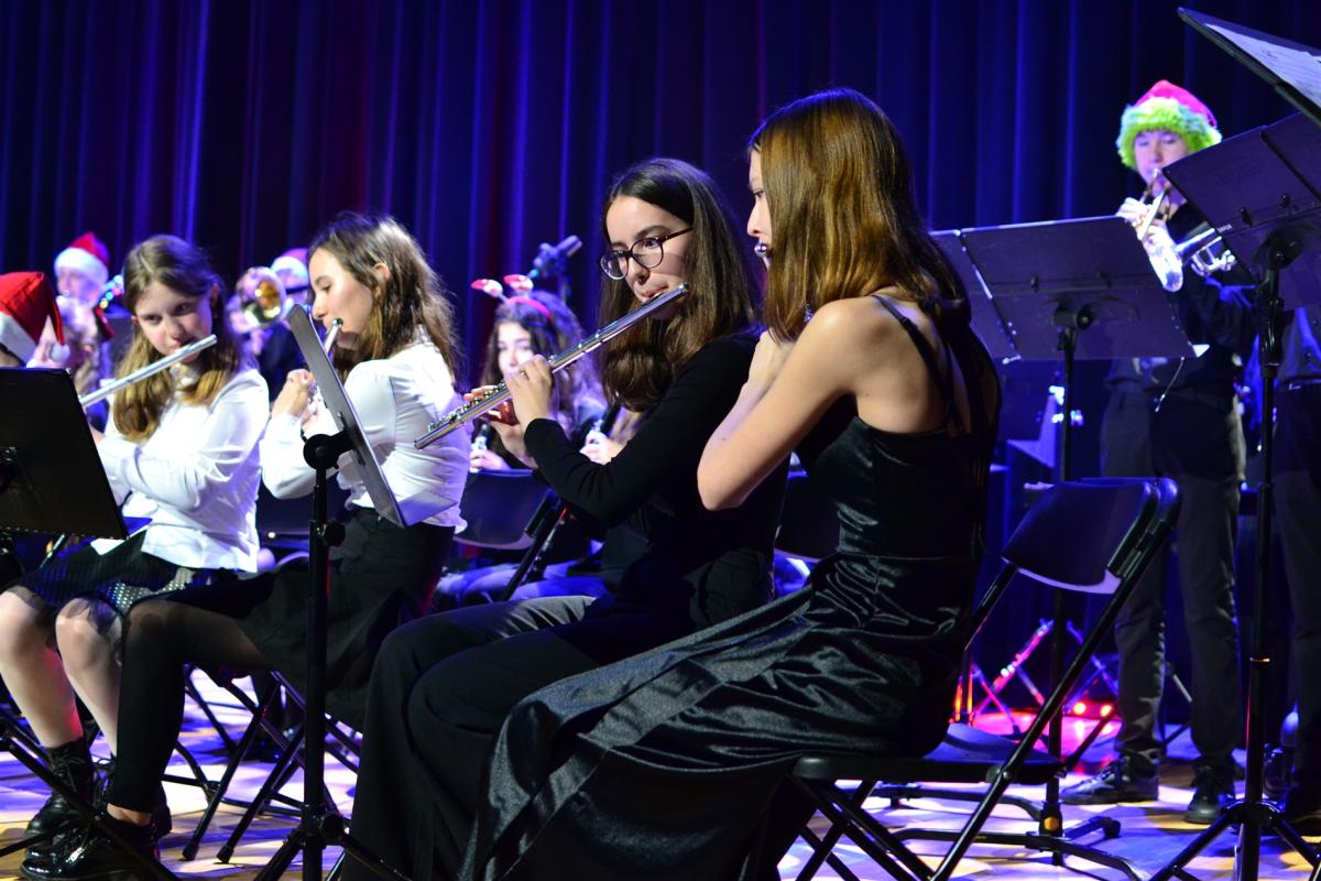 Na scenie często obok uczniów pojawiali się nauczyciele – wspólnie wykonując utwory lub akompaniując młodym artystom. Ta współpraca pokazała nie tylko wysoki poziom artystyczny szkoły, ale też wyjątkową więź, jaka łączy pedagogów z uczniami. Jak co roku nauczyciele przygotowali również muzyczną niespodziankę, wykonując chóralnie „Cichą noc” oraz „Przybieżeli do Betlejem”. Zwieńczeniem wieczoru był występ Orkiestry Dętej, która zaprezentowała „Marsz świąteczny na góralską nutę” Krzysztofa Procka, „A Swinkling Christmas” - wiązankę utworów „Let it Snow”, „White Christmas” i „Frosty the Snowman” dynamiczne „Z kopyta kulig rwie” Waldemara Nowakowskiego.