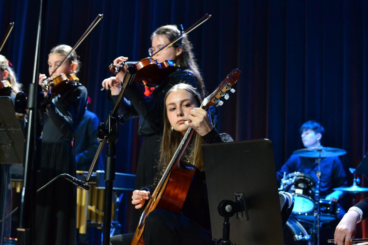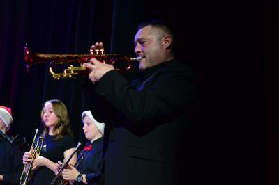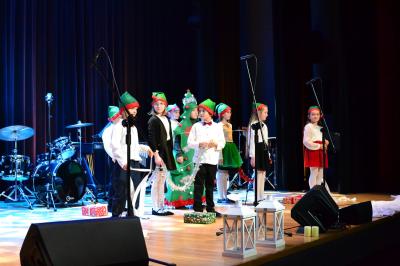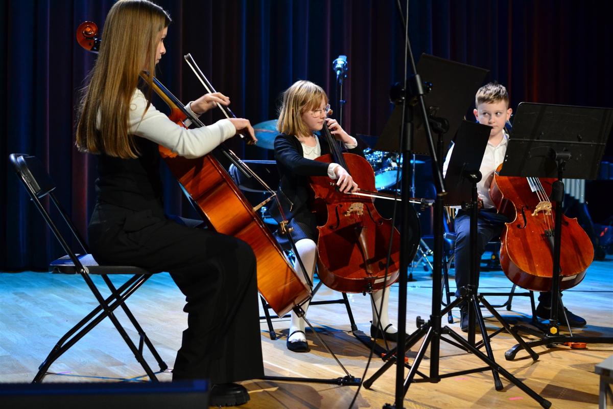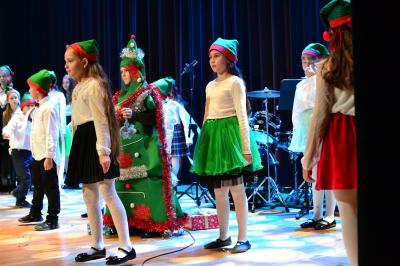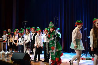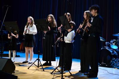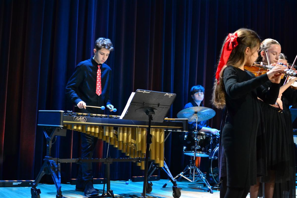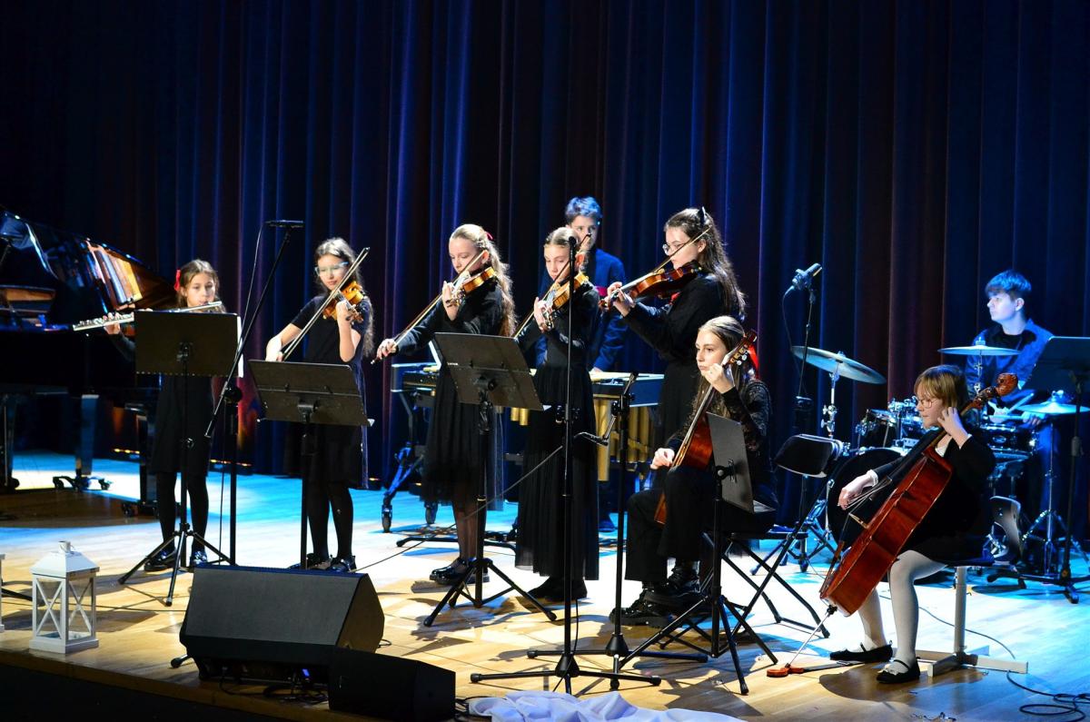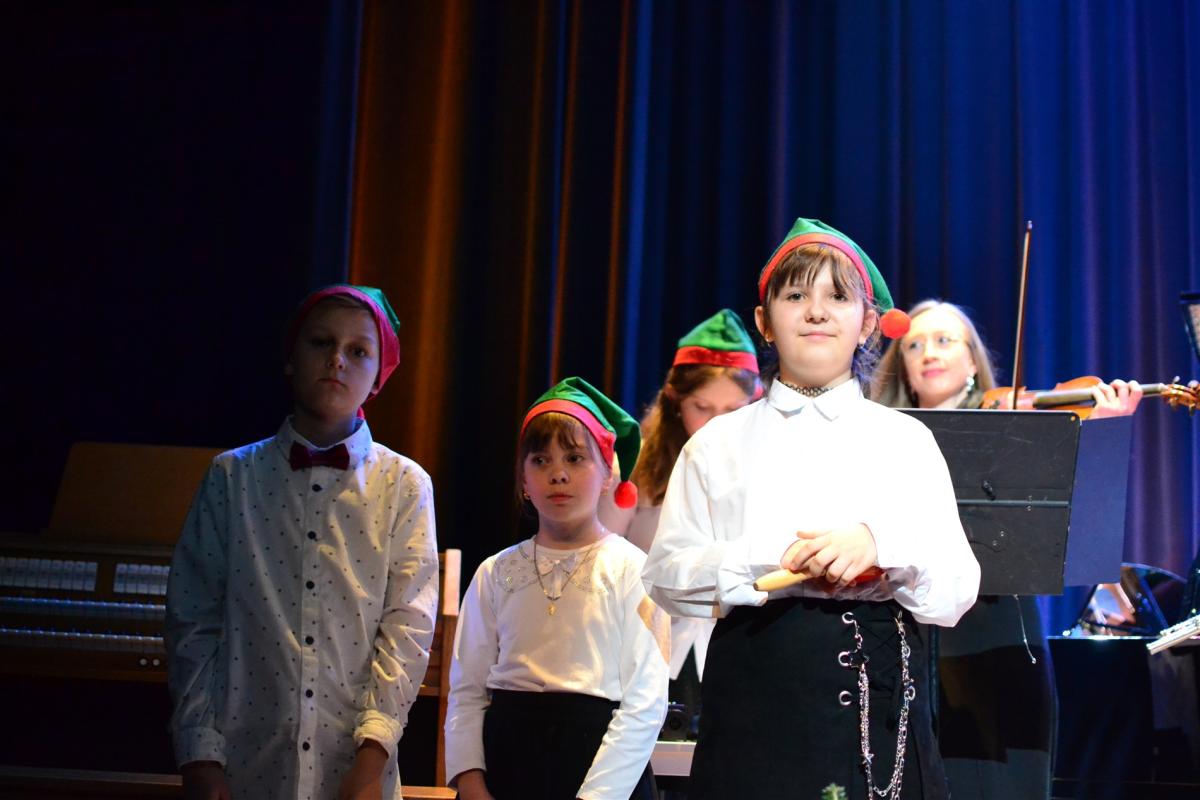 Na scenie często obok uczniów pojawiali się nauczyciele – wspólnie wykonując utwory lub akompaniując młodym artystom. Ta współpraca pokazała nie tylko wysoki poziom artystyczny szkoły, ale też wyjątkową więź, jaka łączy pedagogów z uczniami. Jak co roku nauczyciele przygotowali również muzyczną niespodziankę, wykonując chóralnie „Cichą noc” oraz „Przybieżeli do Betlejem”. Zwieńczeniem wieczoru był występ Orkiestry Dętej, która zaprezentowała „Marsz świąteczny na góralską nutę” Krzysztofa Procka, „A Swinkling Christmas” - wiązankę utworów „Let it Snow”, „White Christmas” i „Frosty the Snowman” dynamiczne „Z kopyta kulig rwie” Waldemara Nowakowskiego.