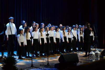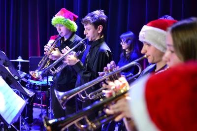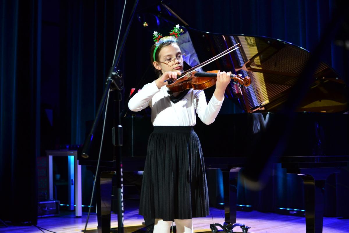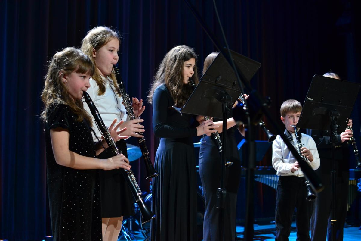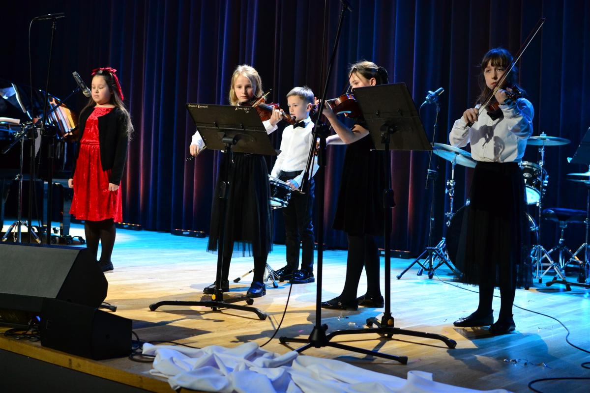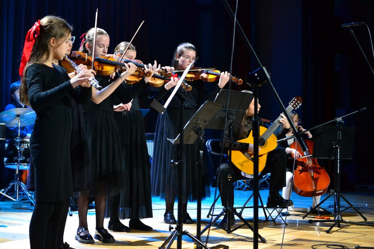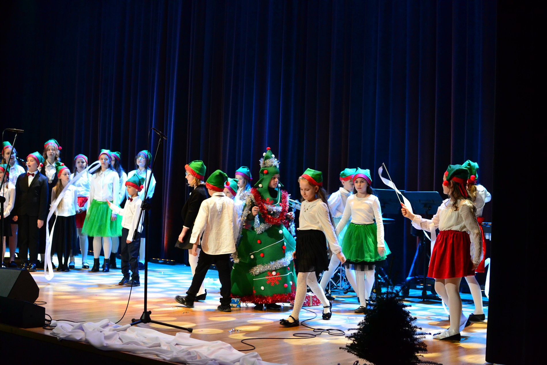 Na scenie często obok uczniów pojawiali się nauczyciele – wspólnie wykonując utwory lub akompaniując młodym artystom. Ta współpraca pokazała nie tylko wysoki poziom artystyczny szkoły, ale też wyjątkową więź, jaka łączy pedagogów z uczniami. Jak co roku nauczyciele przygotowali również muzyczną niespodziankę, wykonując chóralnie „Cichą noc” oraz „Przybieżeli do Betlejem”. Zwieńczeniem wieczoru był występ Orkiestry Dętej, która zaprezentowała „Marsz świąteczny na góralską nutę” Krzysztofa Procka, „A Swinkling Christmas” - wiązankę utworów „Let it Snow”, „White Christmas” i „Frosty the Snowman” dynamiczne „Z kopyta kulig rwie” Waldemara Nowakowskiego.