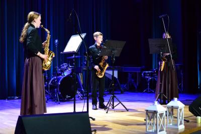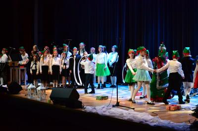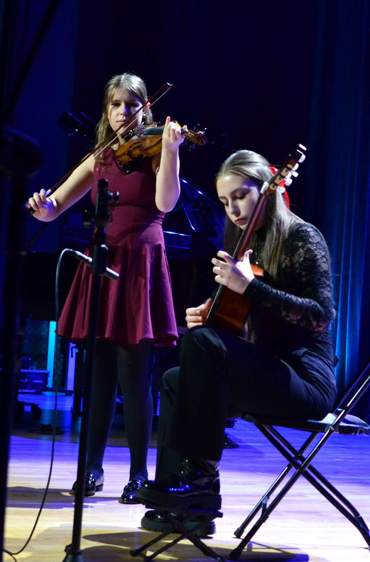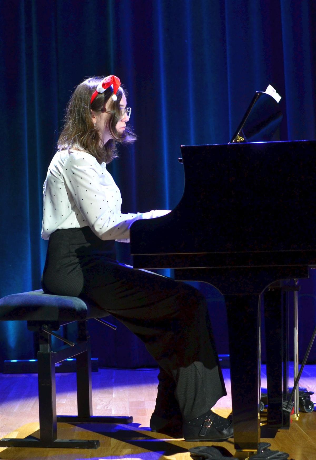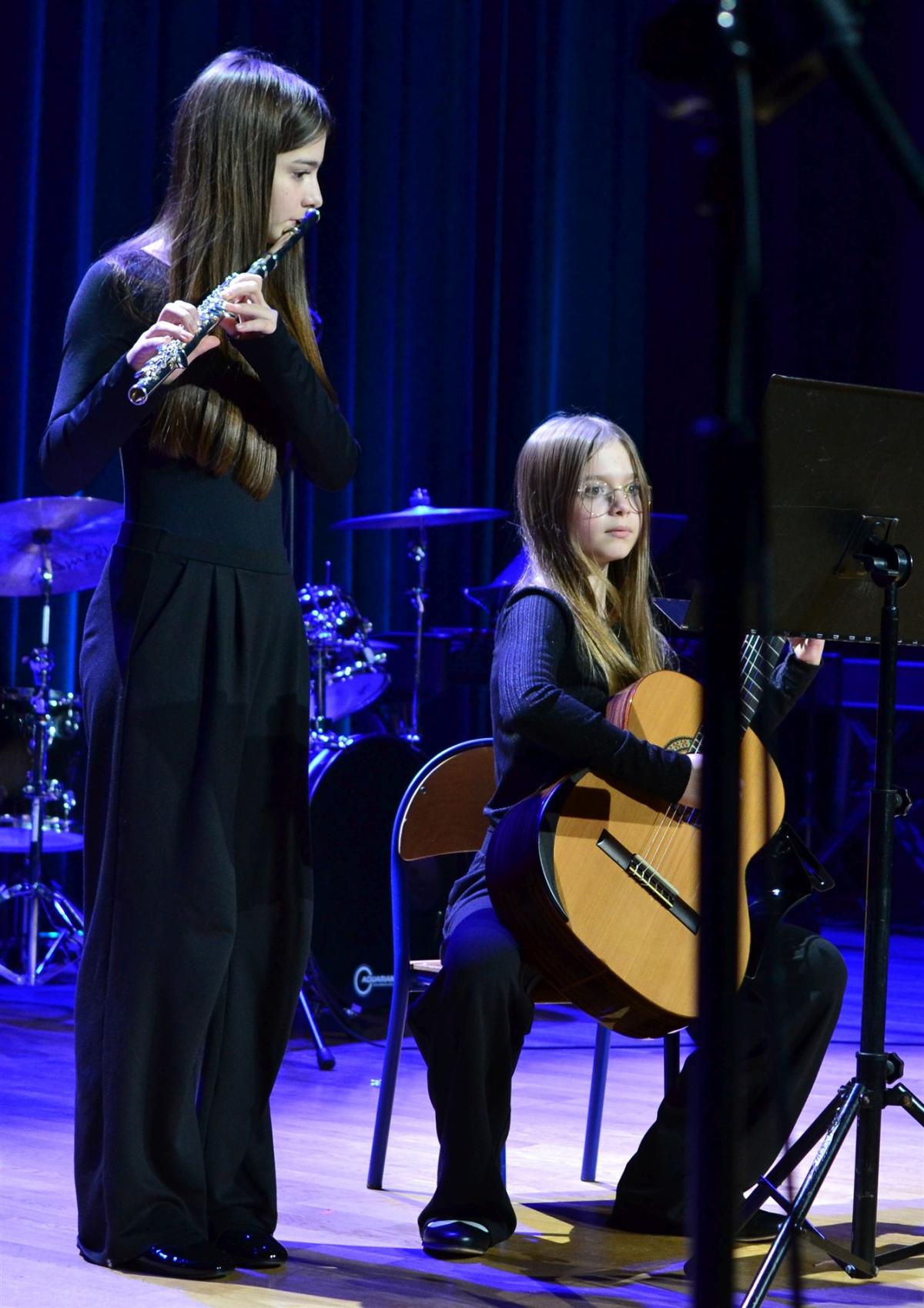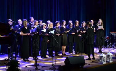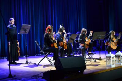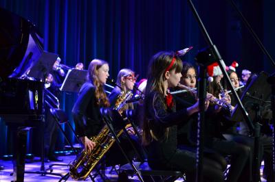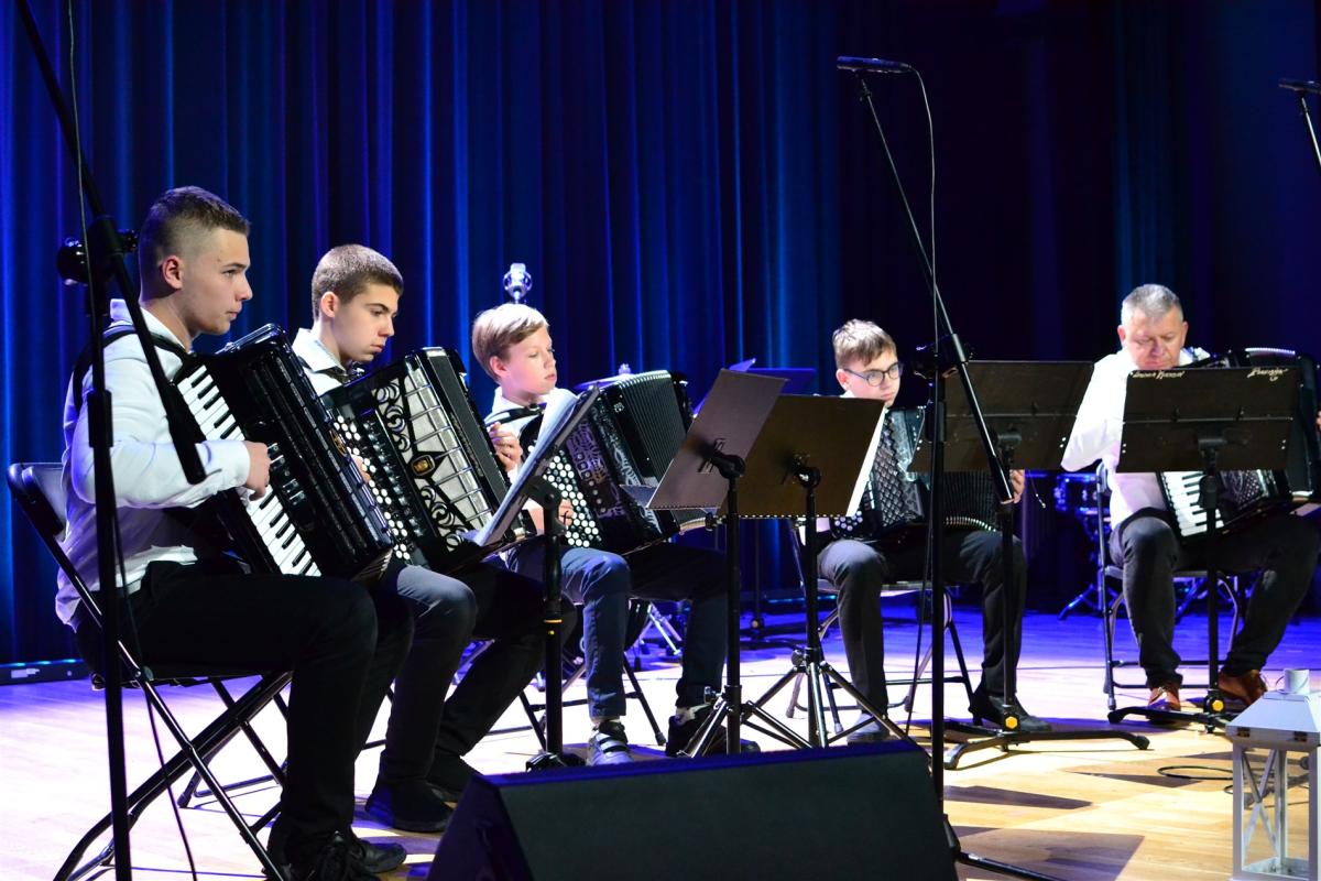 Na scenie często obok uczniów pojawiali się nauczyciele – wspólnie wykonując utwory lub akompaniując młodym artystom. Ta współpraca pokazała nie tylko wysoki poziom artystyczny szkoły, ale też wyjątkową więź, jaka łączy pedagogów z uczniami. Jak co roku nauczyciele przygotowali również muzyczną niespodziankę, wykonując chóralnie „Cichą noc” oraz „Przybieżeli do Betlejem”. Zwieńczeniem wieczoru był występ Orkiestry Dętej, która zaprezentowała „Marsz świąteczny na góralską nutę” Krzysztofa Procka, „A Swinkling Christmas” - wiązankę utworów „Let it Snow”, „White Christmas” i „Frosty the Snowman” dynamiczne „Z kopyta kulig rwie” Waldemara Nowakowskiego.
