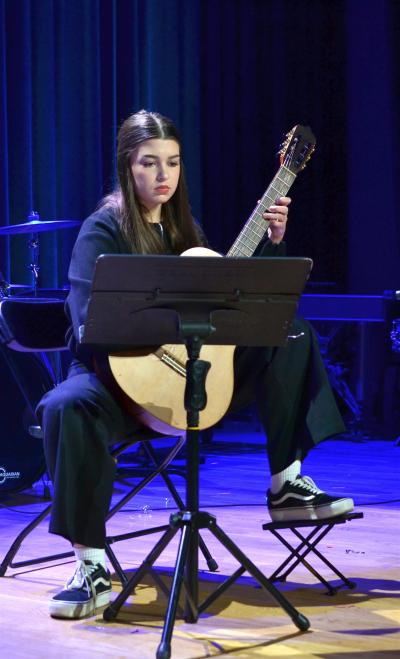 Wydarzenie otworzyła dyrektor szkoły Renata Trybała, która serdecznie powitała zgromadzonych, życząc im niezapomnianych wrażeń muzycznych, radosnych Świąt Bożego Narodzenia oraz wszelkiej pomyślności w nadchodzącym 2026 roku. Jej ciepłe słowa stworzyły atmosferę życzliwości i wspólnoty, która towarzyszyła publiczności przez cały koncert.