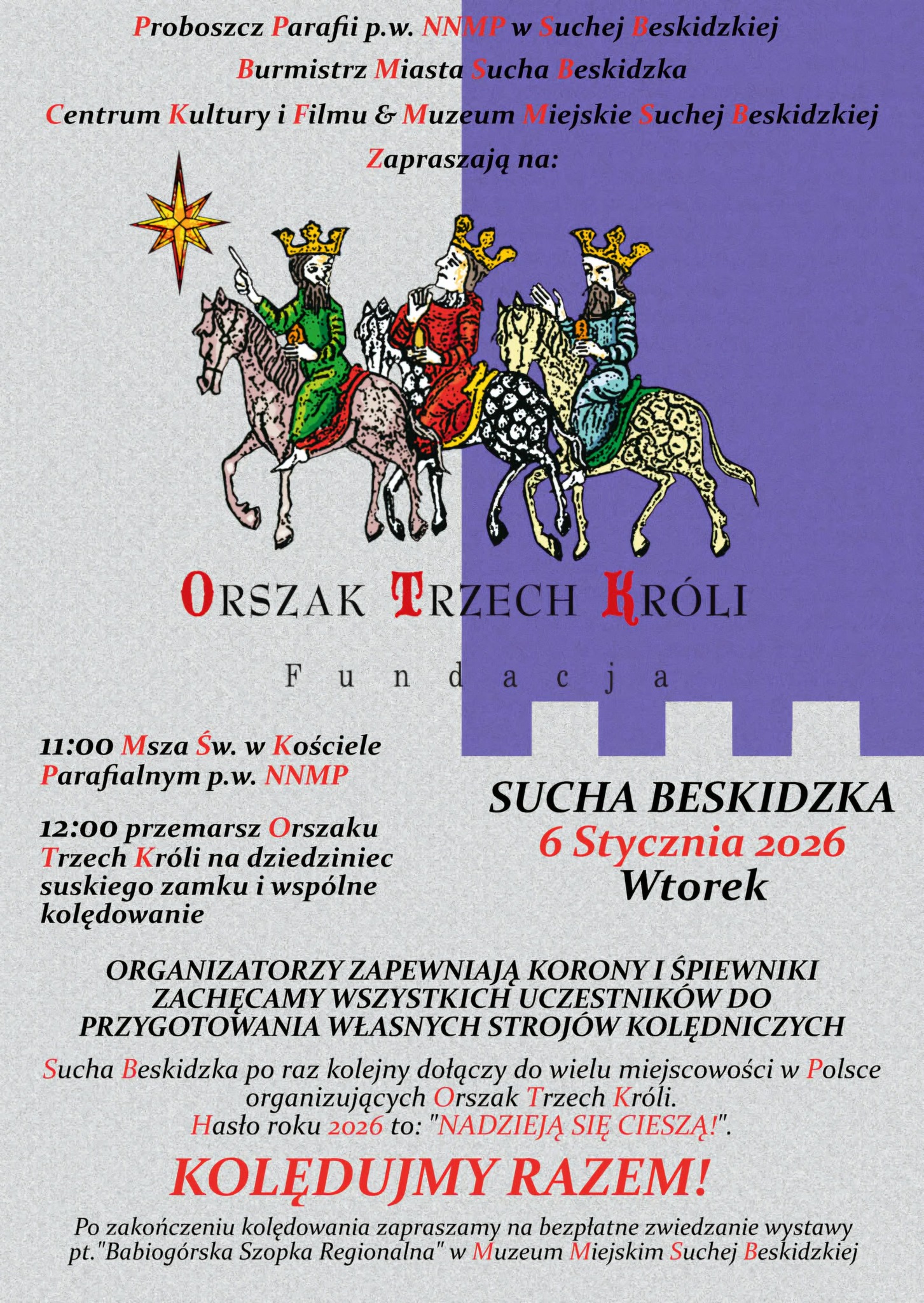 Święto Objawienia Pańskiego należy do najstarszych uroczystości chrześcijańskich, sięgających pierwszych wieków Kościoła. W Suchej Beskidzkiej od lat ma ono szczególny, rodzinny charakter. Barwny orszak, nawiązujący do bogatej polskiej tradycji jasełkowej, jest okazją do wspólnego przeżywania jednego z najważniejszych świąt w roku – radośnie, na świeżym powietrzu i razem.