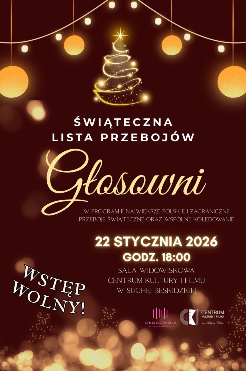 W czwartek, 22 stycznia, sala widowiskowa Centrum Kultury i Filmu w Suchej Beskidzkiej wypełni się dźwiękami, które wielu z nas kojarzą się z ciepłem, wspólnotą i zimowymi wieczorami spędzonymi w domowym zaciszu. O godz. 18:00 odbędzie się koncert „Świąteczna lista przebojów Głosowni” – muzyczne spotkanie, na które organizatorzy zapraszają całe rodziny.