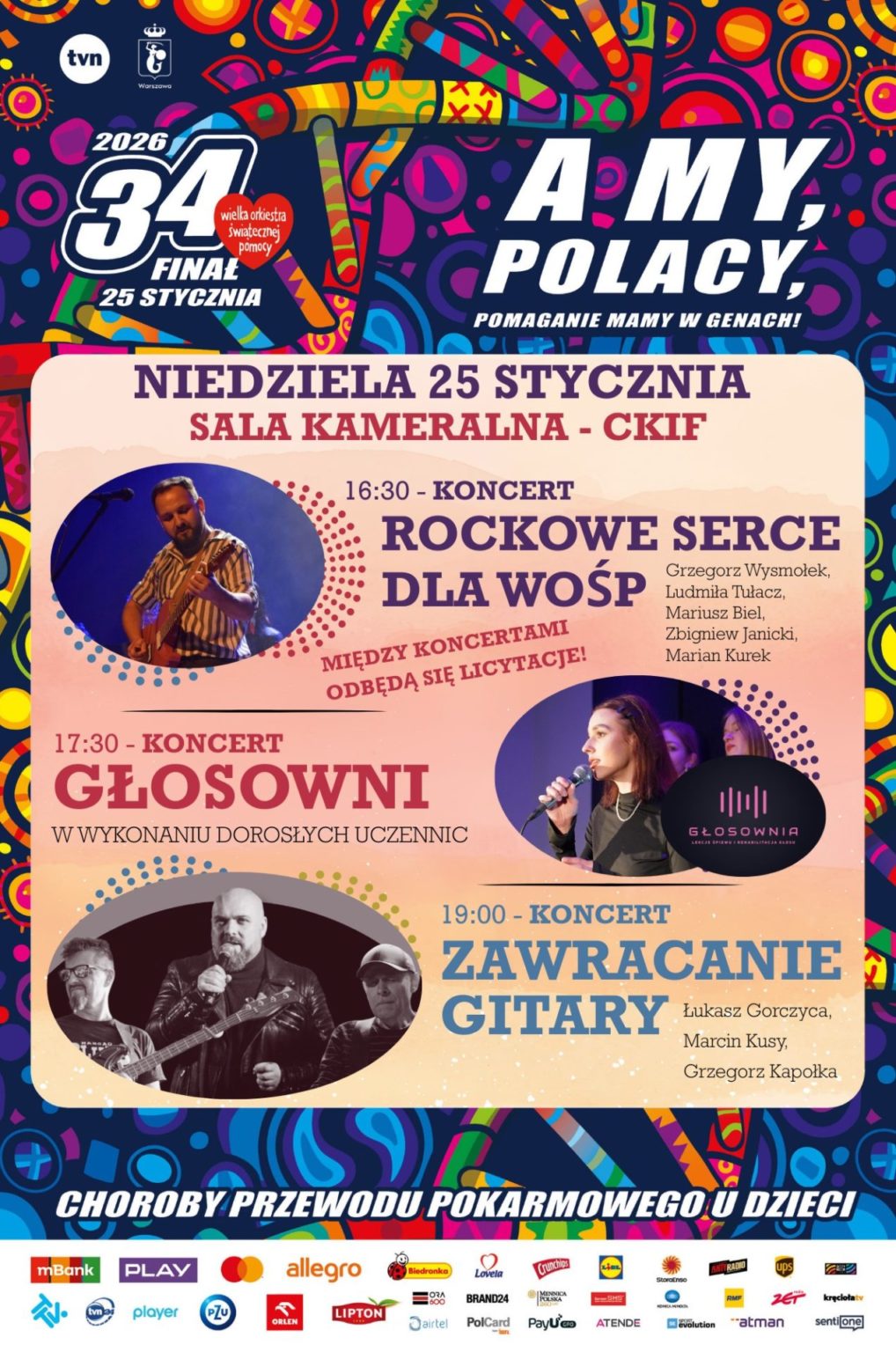 Sercem suskiego finału będzie Sala Kameralna w Centrum Kultury i Filmu, gdzie o godzinie 16.30 rozpocznie się muzyczne popołudnie. Otworzy je koncert „Rockowe Serce dla WOŚP”. Publiczność usłyszy Grzegorza Wysmołka, Ludmiłę Tułacz, Mariusza Biela, Zbigniewa Janickiego oraz Mariana Kurka – artystów, których łączy pasja do muzyki i chęć niesienia pomocy. Godzinę później scenę przejmą dorosłe uczennice Głosowni. Wydarzenie zakończy się o 19:00 koncertem zespołu Zawracanie Gitary, który zagra w składzie Łukasz Gorczyca, Marcin Kusy oraz Grzegorz Kapołka. To propozycja idealna dla tych, którzy lubią gitarowe brzmienia i dobrą energię.