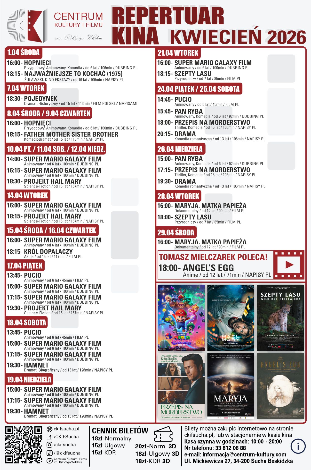 Centrum Kultury i Filmu w Suchej Beskidzkiej przygotowało dla miłośników kina kwietniowy repertuar pełen nowości i długo wyczekiwanych tytułów. Wśród propozycji nie brakuje ani lekkiej rozrywki, ani produkcji skłaniających do refleksji. Widzowie mogą wybierać spośród filmów familijnych i młodzieżowych, komedii, ambitnych dramatów oraz kina autorskiego. Tak zróżnicowana oferta sprawia, że każdy znajdzie coś dla siebie.