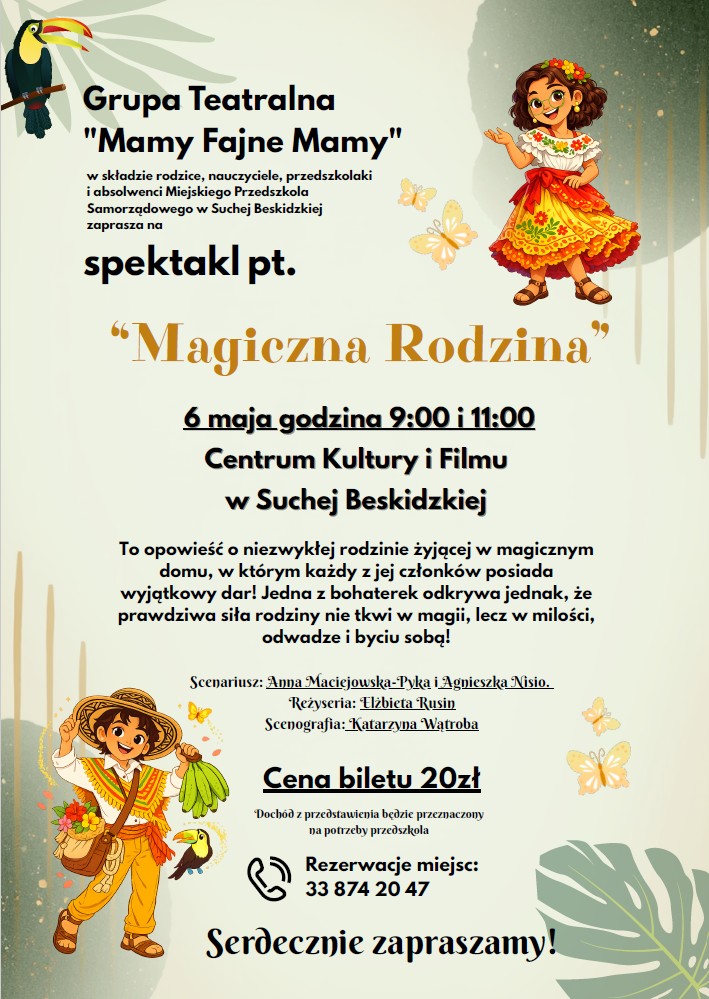 Grupa teatralna „Mamy Fajne Mamy”, działająca przy Miejskim Przedszkolu Samorządowym w Suchej Beskidzkiej ponownie zaprasza mieszkańców na niecodzienne wydarzenie artystyczne. Po bardzo ciepło przyjętym spektaklu „Dziewczyna z wyspy” zespół wraca z nowym spektaklem - „Magiczna rodzina”. Przedstawienie zostanie wystawione 6 maja o godzinach 9.00 oraz 11.00 w Centrum Kultury i Filmu w Suchej Beskidzkiej.