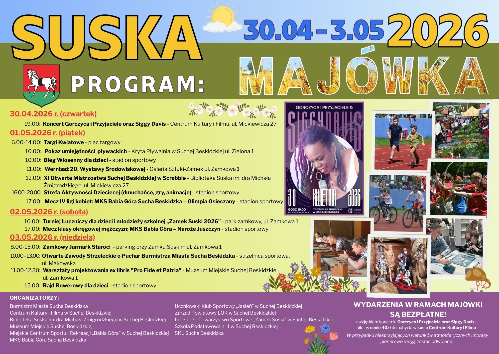 Na szczególne podkreślenie zasługuje fakt, że zdecydowana większość wydarzeń jest bezpłatna, co czyni Suską Majówkę dostępną i otwartą dla szerokiego grona odbiorców. Współtworzą ją miejskie instytucje, organizacje oraz partnerzy, których zaangażowanie przekłada się na wysoki poziom organizacyjny i atrakcyjność programu. To wydarzenie, które nie tylko integruje społeczność, ale również wzmacnia wizerunek Suchej Beskidzkiej jako miasta aktywnego, nowoczesnego i otwartego na mieszkańców oraz turystów.