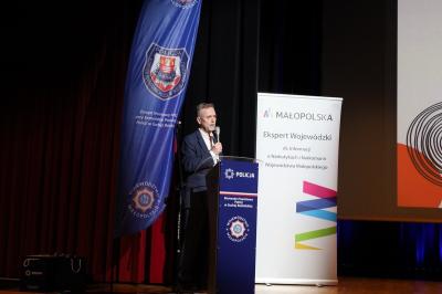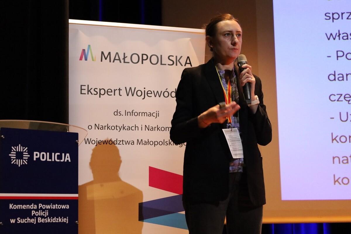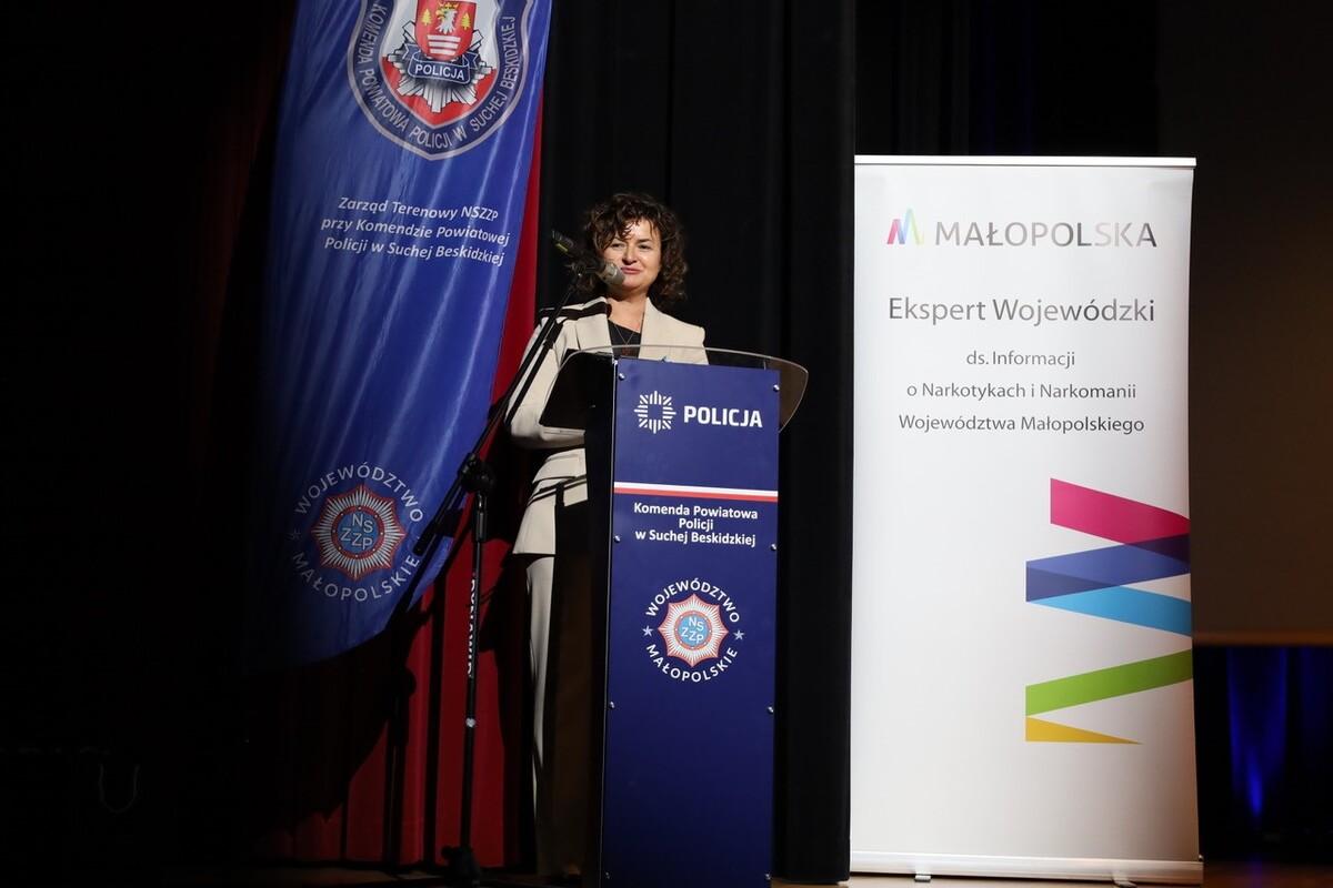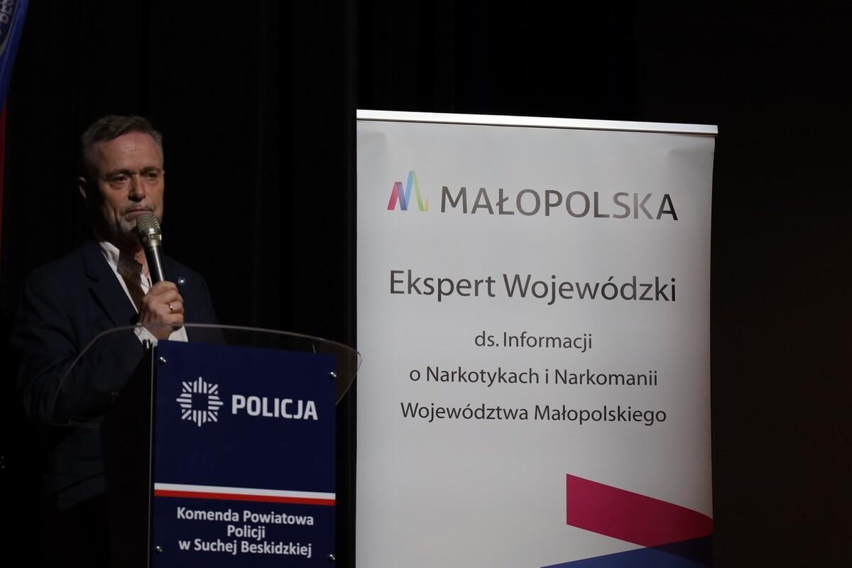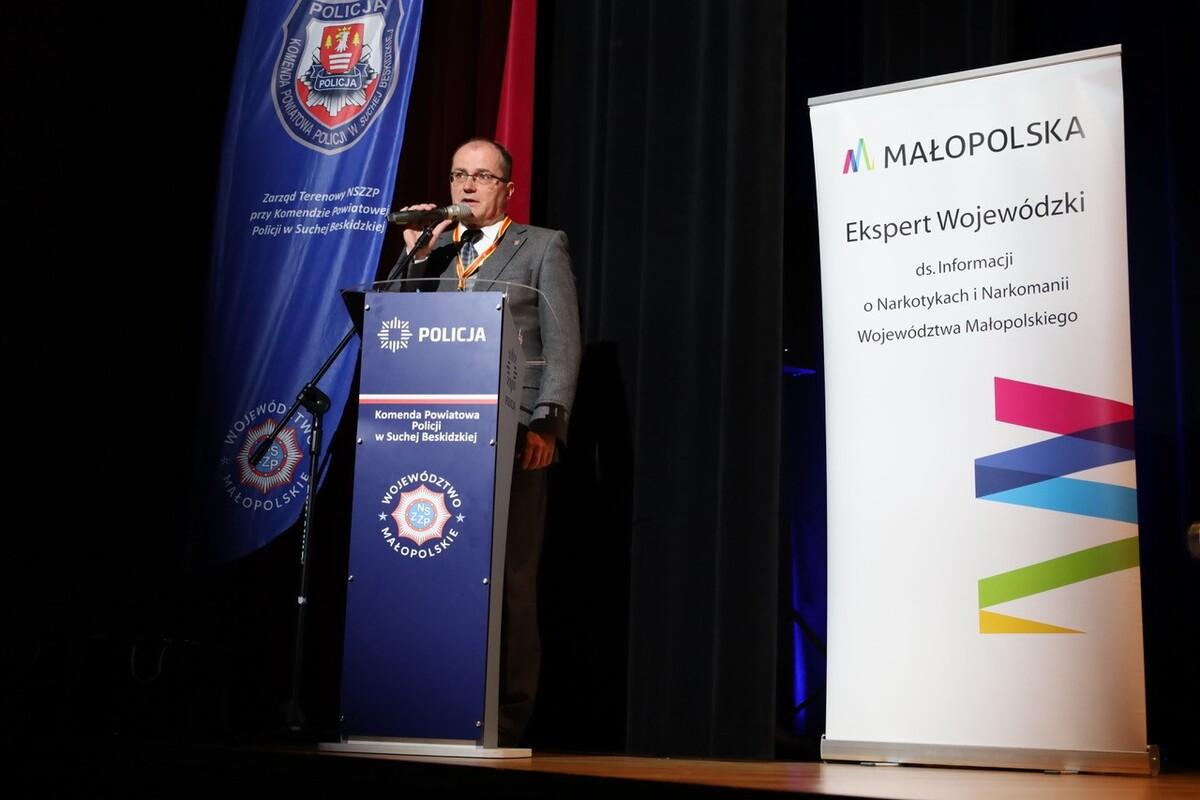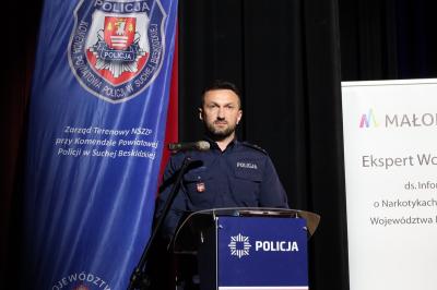 Powiatową Policji w Suchej Beskidzkiej. Przedsięwzięcie wsparli partnerzy: Starostwo Powiatowe, Urząd Miasta w Suchej Beskidzkiej oraz Ekspert Wojewódzki ds. Informacji o Narkotykach i Narkomanii Województwa Małopolskiego. W wypełnionej sali CKiF zasiedli policjanci z naszego oraz sąsiednich powiatów, kuratorzy sądowi, liczni przedstawiciele oświaty, a także pracownicy miejskich i gminnych ośrodków pomocy społecznej.