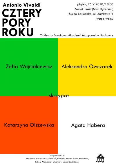 Cztery koncerty skrzypcowe, Cztery pory roku i jeden, jedyny Antonio Vivaldi, włoski skrzypek i kompozytor. Jego arcydzieło okresu baroku wykona na „Małym Wawelu” Orkiestra Barokowa Akademii Muzycznej z Krakowa, która przyjęła zaproszenie Szkoły Muzycznej I stopnia w Suchej Beskidzkiej i uraczy publiczność pięknym koncertem. Orkiestra Barokowa Akademii Muzycznej powołana została przez Rektora Akademii Muzycznej w Krakowie w 2008 roku, skupia osoby zainteresowane stylowym wykonawstwem muzyki dawnej na instrumentach z minionej epoki. Wykonuje repertuar baroku oraz wczesnego klasycyzmu.