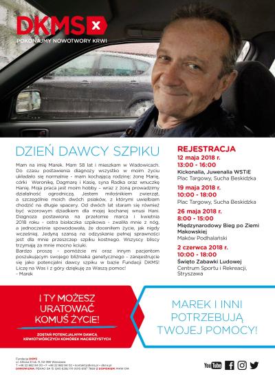 Już 19 maja 2018 r. na suskim placu targowym odbędą się Dni Dawcy Szpiku, od godz. 10.00 do 18.00 będzie możliwość rejestracji potencjalnych dawców szpiku kostnego, pobierając wymaz z wewnętrznej strony policzka za pomocą pałeczek. Dawcą szpiku może zostać każda zdrowa osoba w wieku 18 – 55 lat. Akcja pod hasłem „Marek i Inni potrzebują Twojej pomocy”, dedykowana jest Markowi Książkowi z Wadowic, który zachorował na ostrą białaczkę szpikową oraz wszystkim chorym oczekującym na przeszczep.