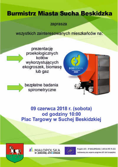 Mieszkańcy zainteresowani wymianą starych kotłów węglowych na ich proekologiczne odpowiedniki będą mogli porównać ofertę firm działających w regionie. Jest to też doskonała okazja, aby uzyskać poradę bezpośrednio od producentów oraz dystrybutorów przy wyborze nowego kotła grzewczego. Podczas prezentacji przedstawiciele Urzędu Miasta w Suchej Beskidzkiej udzielą informacji na temat dopłat na modernizację systemów grzewczych w gospodarstwach domowych i firmach, które można otrzymać w ramach realizowanych przez gminę programów. W trakcie prezentacji proekologicznych kotłów odbędą się także bezpłatne badania spirometryczne. Celem akcji jest ocena kondycji płuc i promocja profilaktyki w zakresie chorób układu oddechowego. Badanie spirometryczne przeprowadzi wykwalifikowany personel w specjalnie do tego celu przystosowanym mobilnym gabinecie (spirobusie). Będzie to dobra okazja, aby sprawdzić wydolność swoich dróg oddechowych, bo spirometria to właśnie pomiar oddychania. Badanie to określa rezerwy wentylacyjne układu oddechowego i pozwala sprawdzić, czy nie rozwijają się w nim choroby.