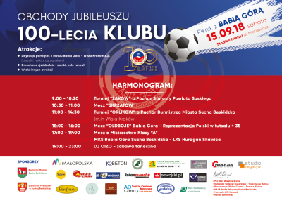 Tak okazałym i szczególnym jubileuszem, którym może się poszczycić miejski klub jest bardzo niewiele na terenie Małopolski. Dlatego obchody 100-lecia istnienia suskiego klubu wymagają odpowiedniej formy i uhonorowania. Uroczystości jubileuszowe trwają cały rok, w czerwcu br., na Stadionie Miejskim rozegrany został historyczny mecz, podczas którego Wisła Kraków zagrała z drużyną Babiej Góry. Kolejnym przedsięwzięciem w ramach obchodów jubileuszu jest piknik, który odbędzie się w najbliższą sobotę. Zarząd klubu przygotował z tej okazji wiele atrakcji dla mieszkańców i przybyłych gości, w tym m.in. mecze i turnieje piłkarskie oraz licytację koszulek i piłek z autografami piłkarzy Wisły Kraków. Dla najmłodszych miłośników suskiej drużyny przygotowane zostaną dmuchane zjeżdżalnie i zamki, a także popularne kule runball. Wieczorem natomiast odbędzie się zabawa taneczna przy oprawie muzycznej Dj OIZO. W związku z obchodzonym Jubileuszem przez cały rok na ręce Prezesa Miejskiego Klubu Sportowego „Babia Góra” Mariusza Korczaka spływają także gratulacje i słowa uznania od wielu osób zarówno tych związanych bezpośrednio z klubem jak również działaczy sportowych z całej Polski.