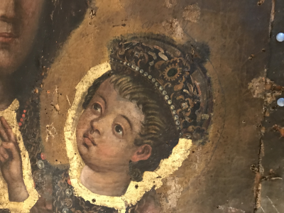 Na owe lustro nałożona została drewniana złocona sukienka w typie Matki Bożej Częstochowskiej. Po zdjęciu wszystkich elementów zasłaniających płótno, okazało się, że właściwy wizerunek Maryi jest niezwykle pięknym ikonicznym dziełem malarskim w typie Hodegetrii, czyli Matki Bożej wskazującej drogę przez swojego Syna (z grec. ή oδηγήτρια, „Wskazująca Drogę”). Nałożone na Madonnę lustro zakryło bardzo dokładnie atrybucje obrazu, namalowanego na płótnie lnianym, które wtórnie, prawdopodobnie pod koniec XIX wieku zostało napięte na deskę. To niezwykłe dzieło malarskie, pędzla bardzo dobrego artysty, reprezentuje kanoniczny wariant wizerunku Hodegetrii, ukazujący Bogurodzicę frontalnie w tzw. ujęciu popiersiowym. Było błędnie datowane na koniec XIX wieku. Błąd wynikał zapewne z faktu, iż wówczas na właściwy obraz zostało nałożone lustro a na nie - drewniana pozłacana sukienka. Dowodem jest bardzo dobrze zachowany odręczny zapis wykonany ołówkiem na odwrociu sukienki z datą „1888 roku” i podpisem fundatora sukienki, którym był suski kościelny Józefa Bańdura. Powodem, a w gruncie rzeczy inspiracją fundacji suszanina była pielgrzymka, którą odbył wcześniej do Rzymu. Wówczas papieżem był Leon XIII, propagujący w swoim nauczaniu również kult maryjny. To właśnie z jego inicjatywy w 1885 roku październik ogłoszony został oficjalnie miesiącem maryjnym. Fundacja sukienki z atrybutami Matki Bożej Częstochowskiej była wyrazem wiary kościelnego, stanowiąc swoiste votum wdzięczności. Stąd tez zapewne „stylizacja” ikony na Madonnę Jasnogórską z inwazyjnymi podmalowaniami w kolorze złotym niektórych elementów, by były niewidoczne pod pokrywą lustra. Twarz Maryi nie posiada jednak charakterystycznych cięć. Przedstawienie suskiej Madonny jest znacznie starsze. Pochodzi prawdopodobnie z końca XVI lub z początku XVII wieku, na co wskazuje zarówno struktura płótna, użyte pigmenty malarskie oraz symbolika.