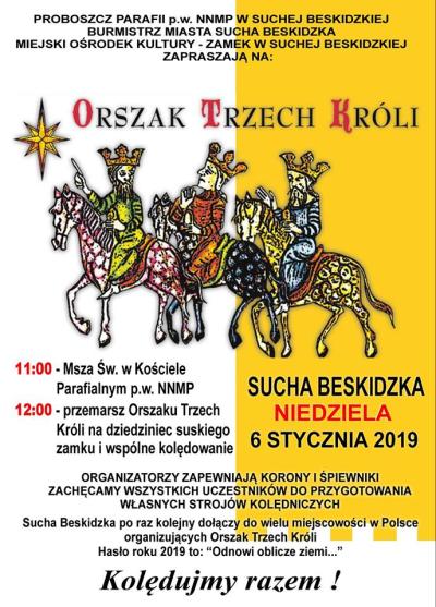 Serdecznie zapraszamy mieszkańców Suchej Beskidzkiej do udziału w największych w Polsce ulicznych jasełkach zwanych „Orszakiem Trzech Króli”. Już po raz piąty wyjdziemy na ulice naszego miasta, by pielęgnować narodową tradycję jasełek i wspólnego kolędowania.
