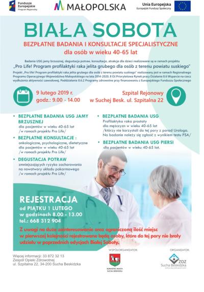 Zagadnienie zdrowia dotyczy nas wszystkich. Dbając o siebie, dajemy przykład innym - rodzinie i znajomym. Dzięki temu możemy kształtować u innych wzorce pozytywnych, prawidłowych zachowań. Lepiej zapobiegać chorobom i schorzeniom, niż później je leczyć. Troska oraz dbanie o własne zdrowie i dobre samopoczucie zależy wyłącznie od nas, to jeden z kilku aspektów życia, na które mamy realny wpływ. Aby uświadomić wagę badań profilaktycznych oraz zapobiegać ewentualnym schorzeniom warto wziąć udział w programie pn. „Biała Sobota” . Każda osoba z terenu miasta Sucha Beskidzka oraz powiatu suskiego w wieku 40-65 lat będzie mogła skorzystać z bezpłatnych badań takich jak USG jamy brzusznej, konsultacji onkologicznych, pielęgniarskich, psychologicznych oraz porad dietetycznych w ramach: „Pro Life! Program profilaktyki raka jelita grubego dla osób z terenu powiatu suskiego” . Dodatkowo zapraszamy do skorzystania z bezpłatnych badań finansowanych przez Gminę Sucha Beskidzka: badań USG piersi, oraz USG w kierunku profilaktyki raka prostaty. Uczestnicy akcji będą mogli również uzyskać komplet informacji o tym jak prowadzić zdrowy tryb życia, jak prawidłowo się odżywiać oraz skosztować potraw, których składniki zmniejszają ryzyko zachorowania na choroby nowotworowe.