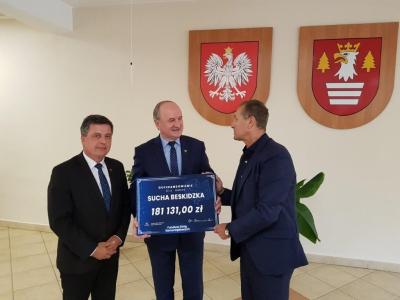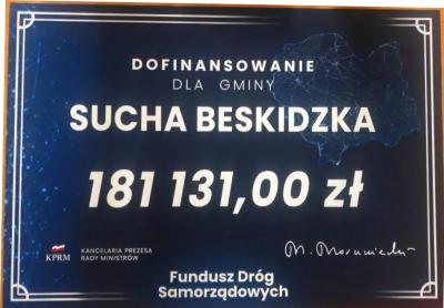 w Małopolsce w kwocie 181.131,00 odebrał Burmistrz Miasta Sucha Beskidzka Stanisław Lichosyt.Uzyskane środki przeznaczone zostaną na dofinansowanie remontu drogi