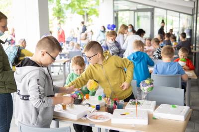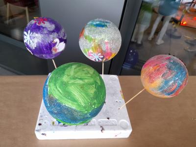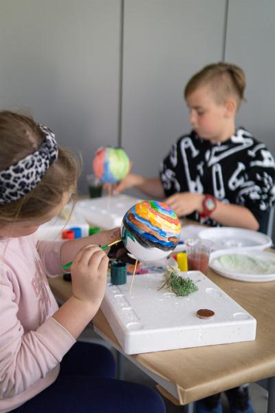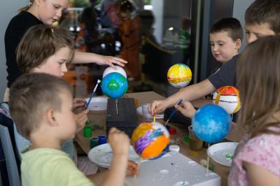 Tego dnia przeobraziły się także sale CKiF, zamieniając się w tematyczne planety, gdzie z pewnością każdy mógł znaleźć coś dla siebie. Na planecie quizu i robotów goście mogli się sprawdzić w interaktywnym quizie z wiedzy o wszechświecie. Odbyły się warsztaty z ozobotami, czyli małymi robotami podążającymi za kolorowymi liniami narysowanymi przez dzieci, co było świetną nauką logicznego myślenia poprzez zabawę. Wraz z ozobotami do wykonania była misja podróży od słońca poprzez wszystkie planety Układu Słonecznego. Na planecie zagadek dla spragnionych łamigłówek został przygotowany specjalny pokój, gdzie zadaniem grupy była współpraca, by wspólnie rozwikłać zagadki dotyczące kosmosu. Mali artyści mogli skorzystać z zajęć pod hasłem „Wymarzona planeta”. Dzieci dały się ponieść fantazji i stworzyć za pomocą prostych materiałów plastycznych (kul styropianowych) swoją wizję idealnej planety w ulubionym kolorze, różnych wzorach, błyszczącej i pełnej kolorowych ozdób. Kreatywność uczestników i ich zaangażowanie przeszły nasze oczekiwania! Ponadto odbyły się zajęcia pokazowe prowadzone przez szkołę tańca ,,Elita’’, zajęcia z baletu oraz wielki, energetyczny finał z zumbą. Na sali widowiskowej pokaz dała grupa baletowa.