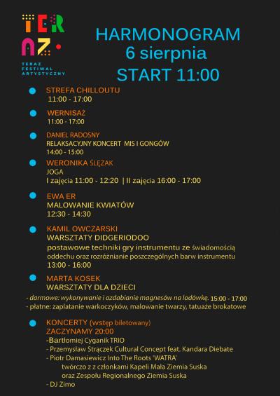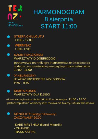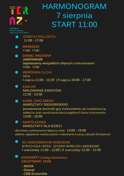 Festiwal „Teraz” jest drugą edycją i zarazem kontynuacją zeszłorocznego festiwalu artystycznego „Potknij się o Jazz”, który spotkał się z bardzo ciepłym przyjęciem zarówno ze strony artystów, jak i publiczności oraz odbiorów. Tegoroczny, to cztery dni warsztatów artystycznych. Zaproszeni goście zaprezentują różne techniki artystyczne, w których realizują się na co dzień. Wzorem roku ubiegłego odbędzie się również wystawa fotograficzna, na której będzie można spotkać autorów prac. A dopełnieniem będą wieczorne koncerty.