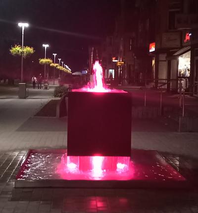 Teraz osoby, które spacerują promenadą, czy też pokonują ją podążając do Centrum Kultury i Filmu lub po prostu załatwiając codzienne sprawunki mogą nacieszyć oko nową atrakcją. Z inicjatywy Burmistrza Miasta na deptaku ustawiono efektowną fontannę. Jej bryła komponuje się z otoczeniem, tworząc spójną całość. Wyjątkową atmosferę wodotrysk tworzy po zmierzchu. Zamontowana w jego konstrukcji iluminacja sprawia, że woda w efektowny sposób podświetlana jest zmieniającymi się kolorami.