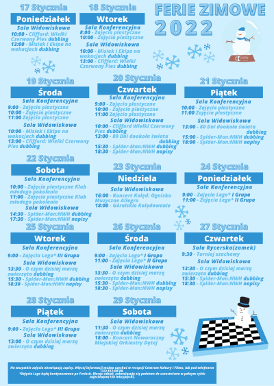 Bogatą ofertę przygotowało na ferie Centrum Kultury i Filmu w Suchej Beskidzkiej. W trakcie dwóch tygodni organizowane będą między innymi zajęcia plastyczne, z robotyki – zajęcia z klockami Lego oraz plastyczne – Klub młodego pokolenia. Odbędzie się także coroczny turniej szachowy. Natomiast w kinie wyświetlone będą „Clifford Wielki Czerwony Pies”, „Misiek Ekipa na wakacjach”, „80 Dni dookoła świata”, „Spider-Man bez drogi do domu” w wersji z Dubbingiem oraz napisami oraz „O czym dzisiaj marzą zwierzęta”. Nie zabraknie również koncertów.