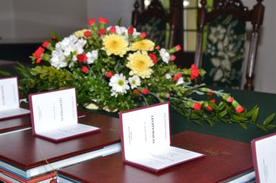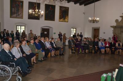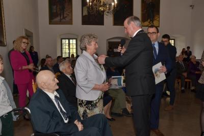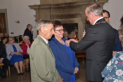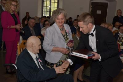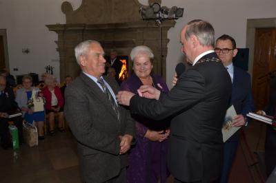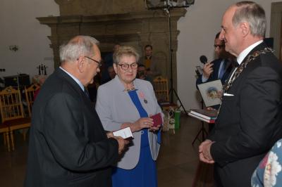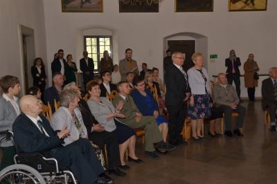 Wyróżnione pary to Wiesława i Julian Barcikowie, Anna i Leszek Bednarzowie, Anna i Władysław Fludrowie, Teodozja Hajduk-Sobczyk i Janusz Sobczyk, Łucja i Edward Kałużowie, Elżbieta i Jan Kumorkowie, Barbara i Kazimierz Kupczykowie, Grażyna i Marian Lenartowie, Grażyna i Władysław Sikorowie, Danuta i Jan Toczkowie, Maria i Ryszard Wesołowscy. Burmistrz Miasta odznaczając jubilatów wręczył jednocześnie listy gratulacyjne i upominki od władz samorządowych. Witając gości podkreślił, że zaproszone pary pięćdziesiątą rocznicę małżeństwa obchodziły już w ubiegłym roku, ale z uwagi na sytuację epidemiczną i w trosce o zdrowie gości niemożliwe było wcześniejsze zorganizowanie uroczystości Złotych Godów. Gratulował jubilatom wytrwałości i stawiał za wzór szczególnie dla młodych pokoleń wstępujących w związki małżeńskie. Podkreślił, że gdy nawet najcięższe obowiązki dźwiga się razem, to stają się one lżejsze, a świętujący jubileusz potrafili przezwyciężać trudności, wykazując się wyrozumiałością.