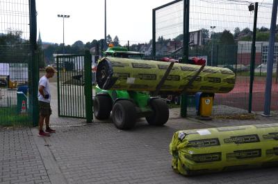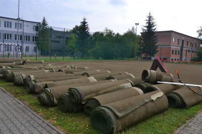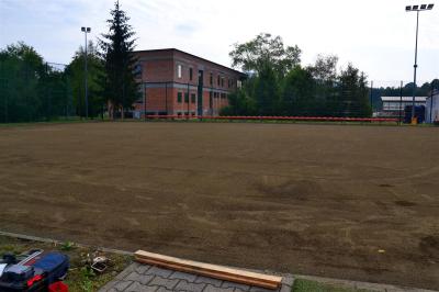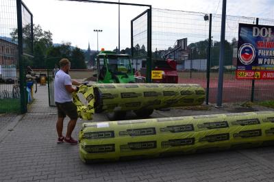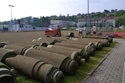 Pierwszym etapem wczoraj rozpoczętych prac było zdjęcie trawy. Obecnie trwa uzupełnianie ewentualnych ubytków w podbudowie i kładzenie warstwy wyrównawczej, na której ułożona będzie sztuczna trwa trzeciej generacji posiadająca matę elastyczną (tzw. shock pad) o parametrach FIFA Quality Concept for Football Turf dla poziomu minimum FIFA QUALITY. Dzięki temu znacząco podniesie się komfort gry, co zapewne dostrzegą i docenią wszyscy użytkownicy boiska.