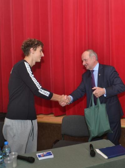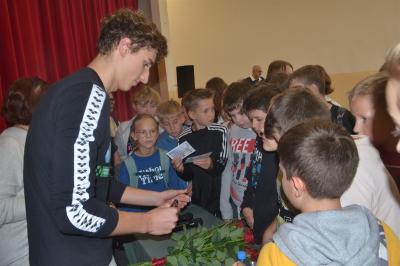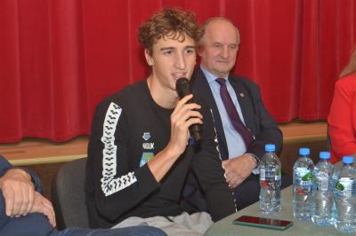 Podczas poniedziałkowego spotkania z uczniami Szkoły Podstawowej nr 1 Ksawery Masiuk opowiedział o początkach swojej przygody z pływaniem, nie ukrywając, że uprawianie tej dyscypliny sportu wymagało i wymaga nadal od niego wielu wyrzeczeń i poświęceń. Wspomniał, że sukcesy po które teraz sięga byłyby niemożliwe bez wsparcia ze strony rodziców, którzy szczególnie na początkowym etapie mobilizowali go do treningów. Odpowiadając na zadawane przez uczniów pytania, pływak opowiadał o swojej diecie, treningach, przygotowaniach do zawodów. Wśród padających z sali pytań nie brakowało także związanych z futbolem, ale również innymi dziedzinami życia niż sport. Spotkanie przebiegało bowiem w swobodnej atmosferze, a Ksawery Masiuk udowodnił, że pozostał niezwykle skromnym, otwartym człowiekiem, łatwo nawiązującym kontakt z innymi.