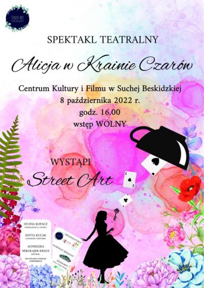 Drugim akcentem DOFE w Centrum Kultury i Filmu będzie właśnie popołudniowy spektakl teatralny „Alicja w krainie czarów", który jest swoistym połączeniem teatru słowa, sztuk ulicznych, muzyki i tańca. Został przygotowany przez "StreetArt", czyli nieformalną grupę młodych ludzi z Suchej Beskidzkiej i najbliższych okolic. Sama "Alicja w krainie czarów" to barwna inscenizacja oparta na kanwie powieści Lewisa Carrolla. Pomysłodawcą projektu jest pani Sylwia Kopacz, a reżyserami: Edyta Kucak i Agnieszka Mikołajek Kraus. Z uwagi na duże zainteresowanie spektaklem wejściówki na ten termin zostały już rozprowadzone. Z tego względu w późniejszym terminie (będziemy o nim informować) grupa planuje wystawianie spektaklu ponownie.