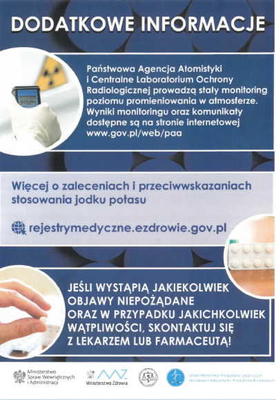 Państwowa Agencja Atomistyki na bieżąco monitoruje sytuację i uspokaja, że obecnie na terenie Polski nie występuje zagrożenie radioaktywne. Niestabilna sytuacja w różnych regionach świata powoduje, że nie można całkowicie wykluczyć wystąpienia incydentu atomowego, którego skutkiem może być uwolnienie do atmosfery radioaktywnego jodu. Wchłonięcie go znacząco zwiększa ryzyko rozwoju nowotworu tarczycy. I właśnie aby temu zapobiec podawana jest w razie konieczności dodatkowa dawka stabilnego jodu (w postaci jodku potasu). Przyjęta zawczasu (maksymalnie do 8 godzin po wystąpieniu skażenia) chroni tarczycę przed wchłonięciem szkodliwego promieniotwórczego izotopu tego pierwiastka.