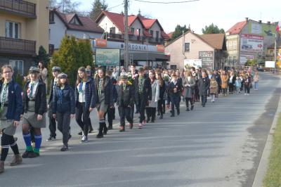 Po nabożeństwie przedstawiciele samorządu, instytucji i stowarzyszeń oraz licznie zebrani mieszkańcy miasta w asyście pocztów sztandarowych wzięli udział w uroczystym przemarszu prowadzonym przez Miejską Orkiestrę Dętą na ulicę Józefa Piłsudskiego, aby złożyć wieńce i kwiaty pod tablicą upamiętniającą postać Marszałka i oddać hołd tym, którzy walczyli o naszą niepodległość. Tego dnia Wartę Honorową w tym miejscu oraz na suskim cmentarzu przy pomniku poległych żołnierzy pełnili harcerze Związku Harcerstwa Polskiego z Drugiego Szczepu Drużyn Harcerskich „Horyzont“ w Suchej Beskidzkiej oraz Jednostka Strzelecka 3031 Sucha Beskidzka. Na początku tej części uroczystości zebrani odśpiewali Hymn Państwowy, a po złożeniu kwiatów orkiestra wykonała „Rotę”, która w rocznicę odzyskania przez Polskę niepodległości wybrzmiewa w sposób szczególny.