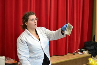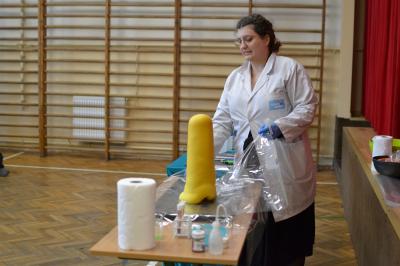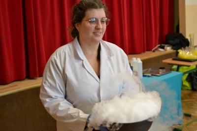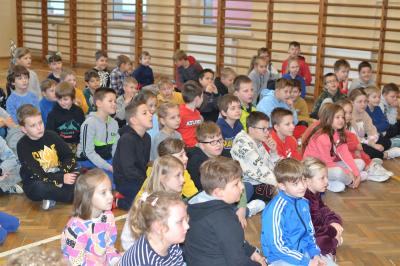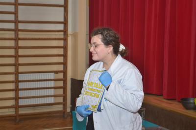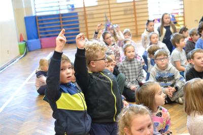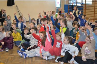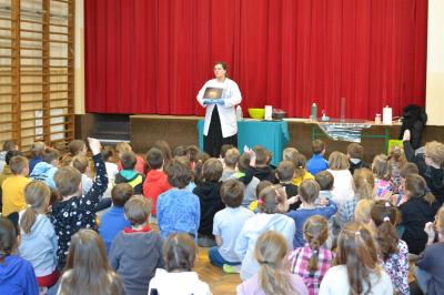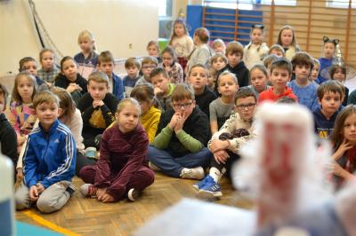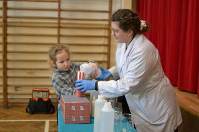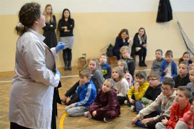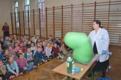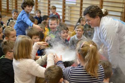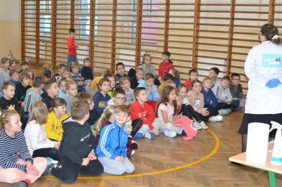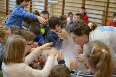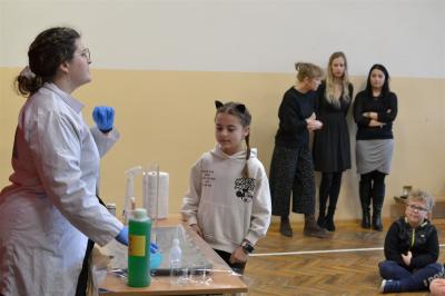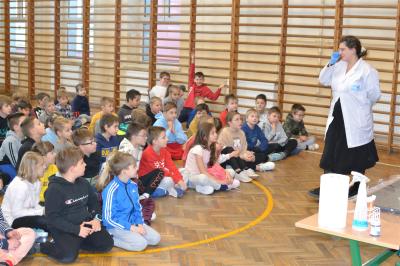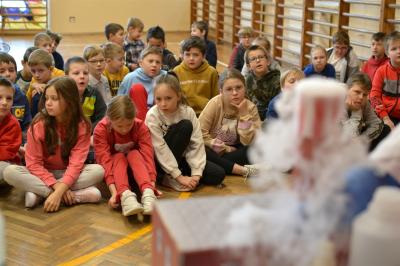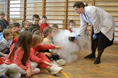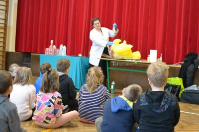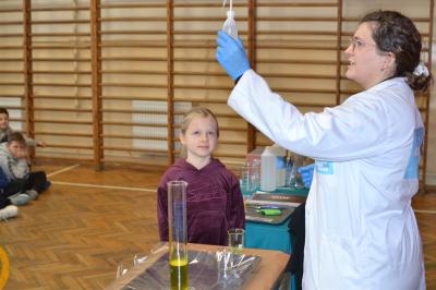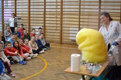 W trakcie pokazów (dwa odbyły się w Szkole Podstawowej nr 1, a po jednym w Szkole Podstawowej nr 2 i jej Filii) przygotowanych przez krakowski zespół Chemical World uczniowie obejrzeli doświadczenia, które wprowadziły ich w tajemniczy, intrygujący, a momentami zachwycający świat chemii. Aby jednak młodzi uczestnicy warsztatów się nie nudzili, to zajęcia miały formę zabawy. Na początku przy użyciu cylindra wyczarowano kolorową i ogromną pianę! W ten spektakularny sposób nawiązano do ochrony środowiska, a w szczególności powietrza i tego co się dzieje, gdy palimy śmieci . Omawiając skład powietrza, przypomniano, że tlen nie jest tym pierwiastkiem, którego jest w nim najwięcej. W dalszej części pokazu przedstawiono uczniom na przykładzie fabryki oraz zjawiska sublimacji, do którego wykorzystano suchy lód czym jest smog, jak powstaje i przestrzeżono przed jego niekorzystnym wpływem na zdrowie.